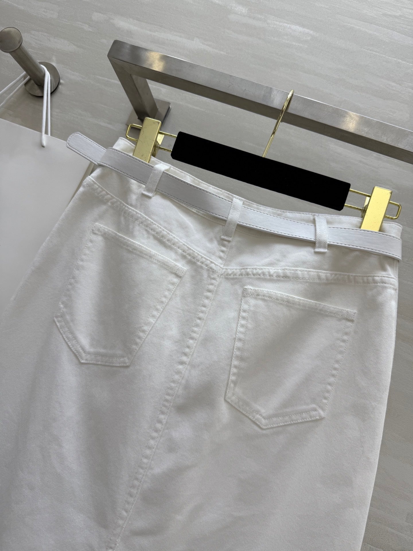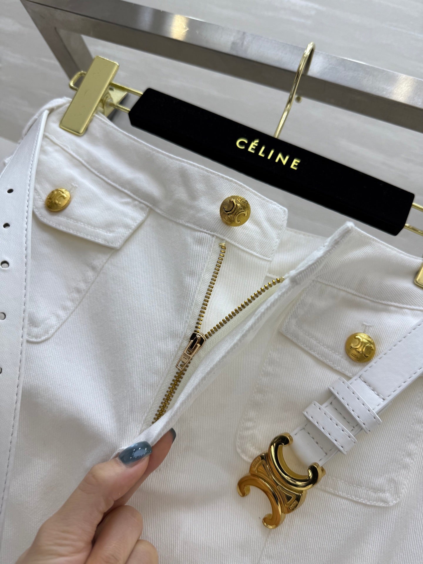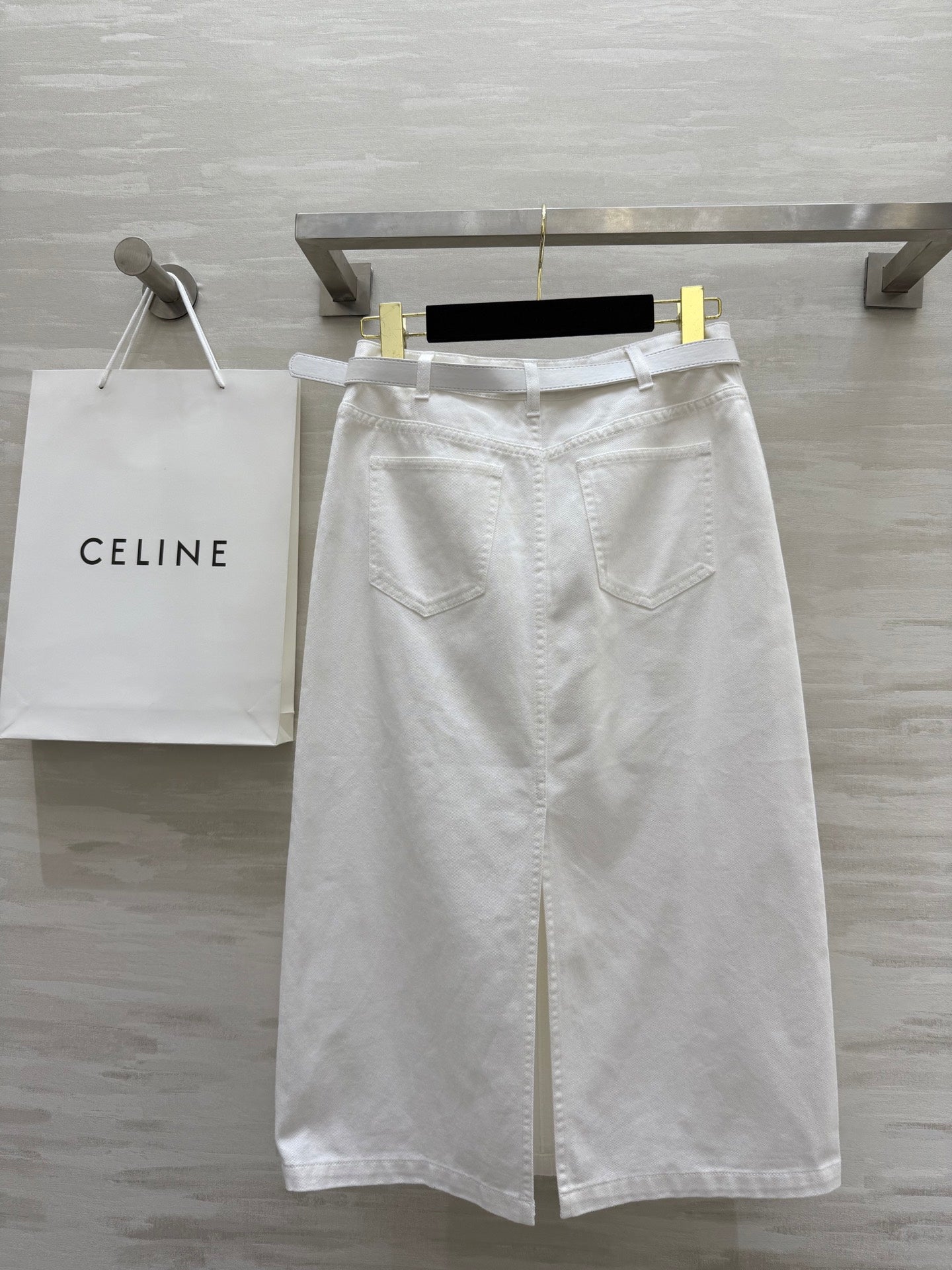 Celine 25 Denim Skirt with Logo Belt White Cotton
