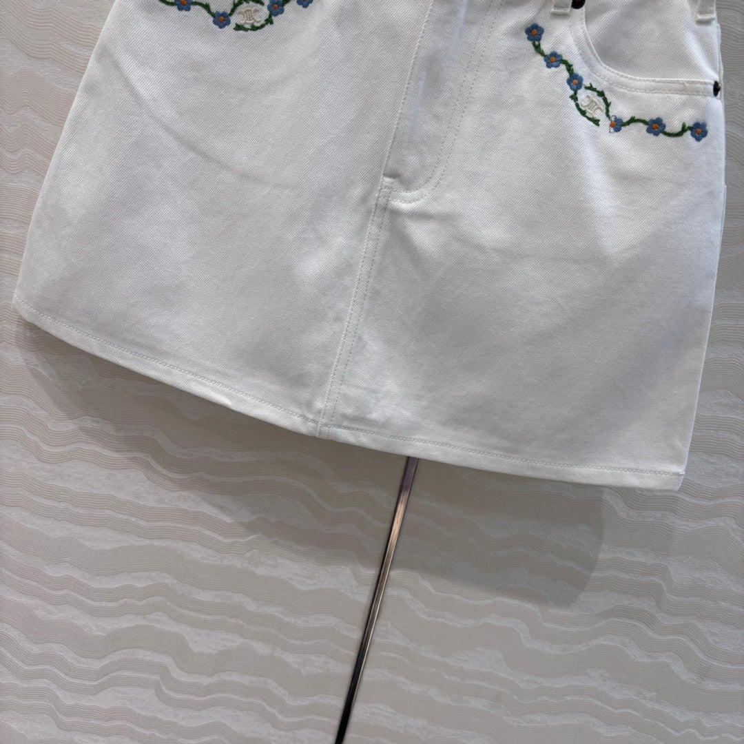 Celine 25 Embroidered Small Flower Skirt White Cotton