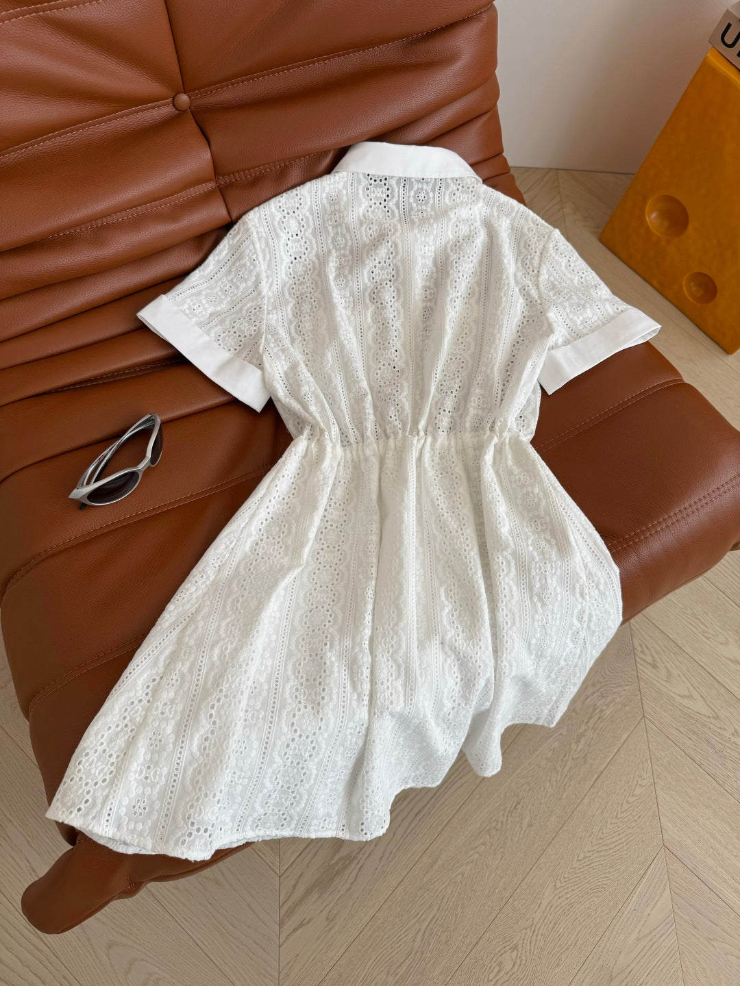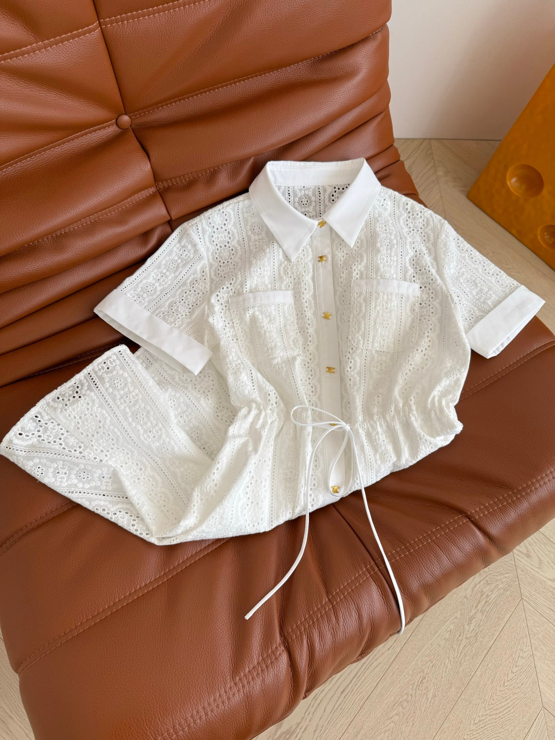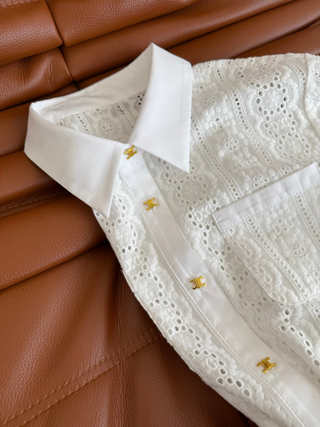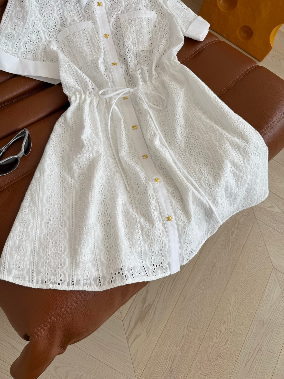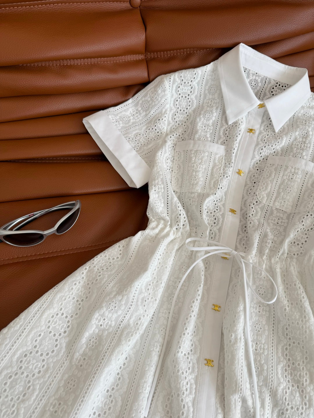 Celine 25 Hollow Shirt Dress with Gold Metal Button White Cotton