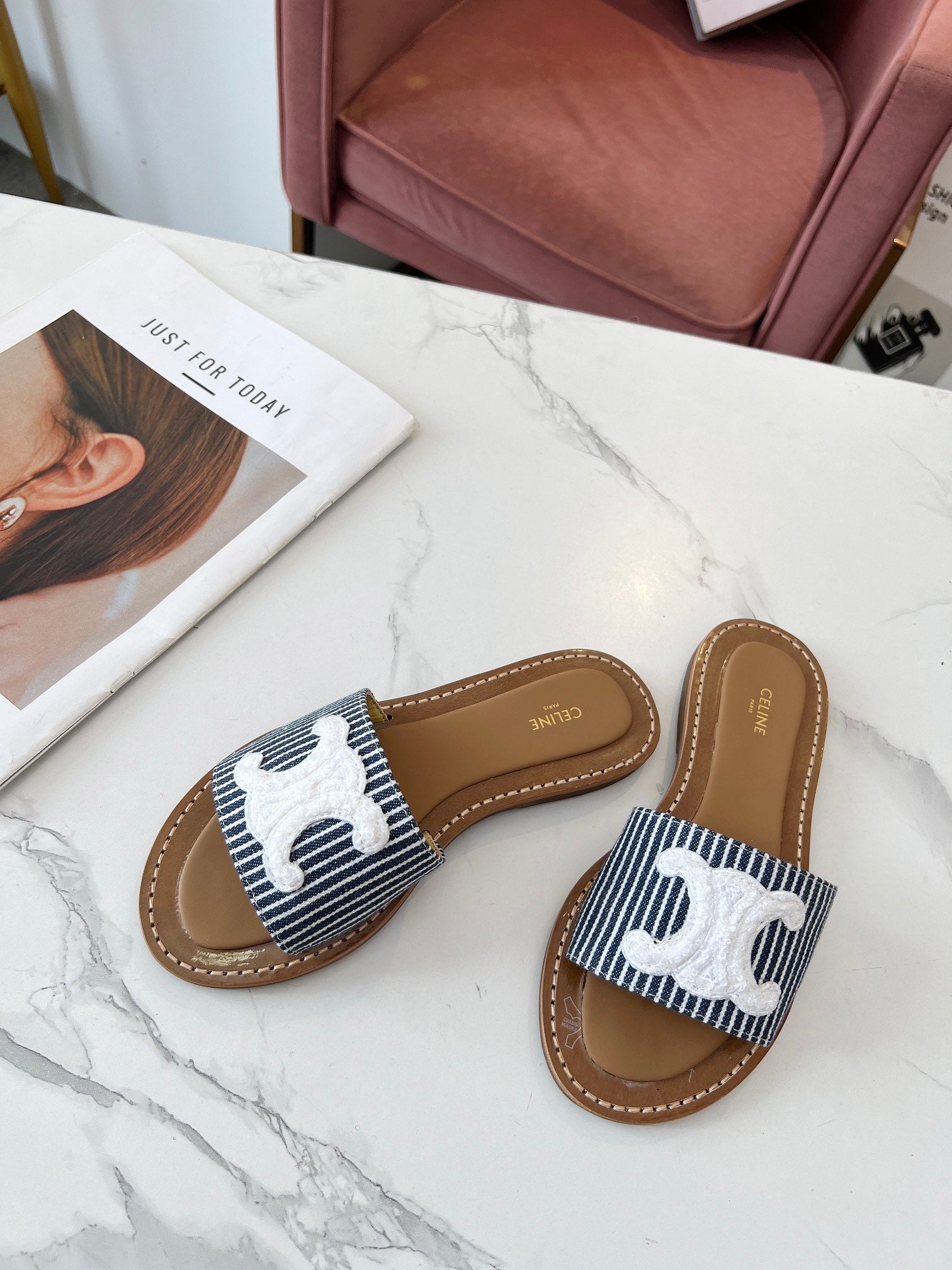 Celine 25C Slippers Navy Blue mix White Fabric with Calfskin 238166