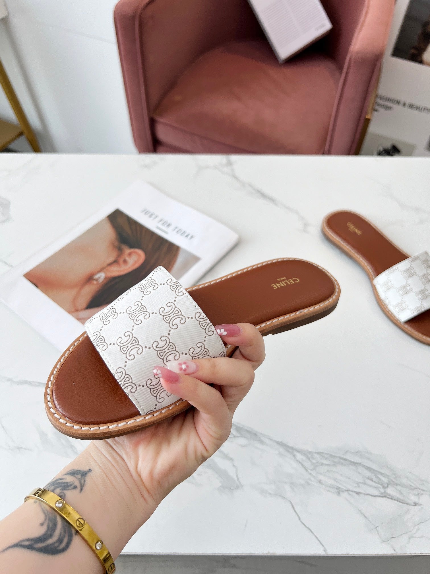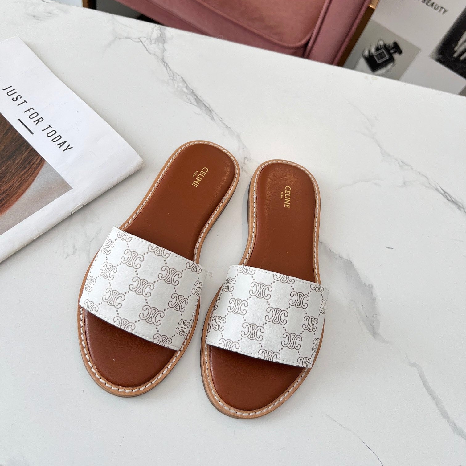 Celine 25C Slippers White Monagram Silk with Calfskin 238145