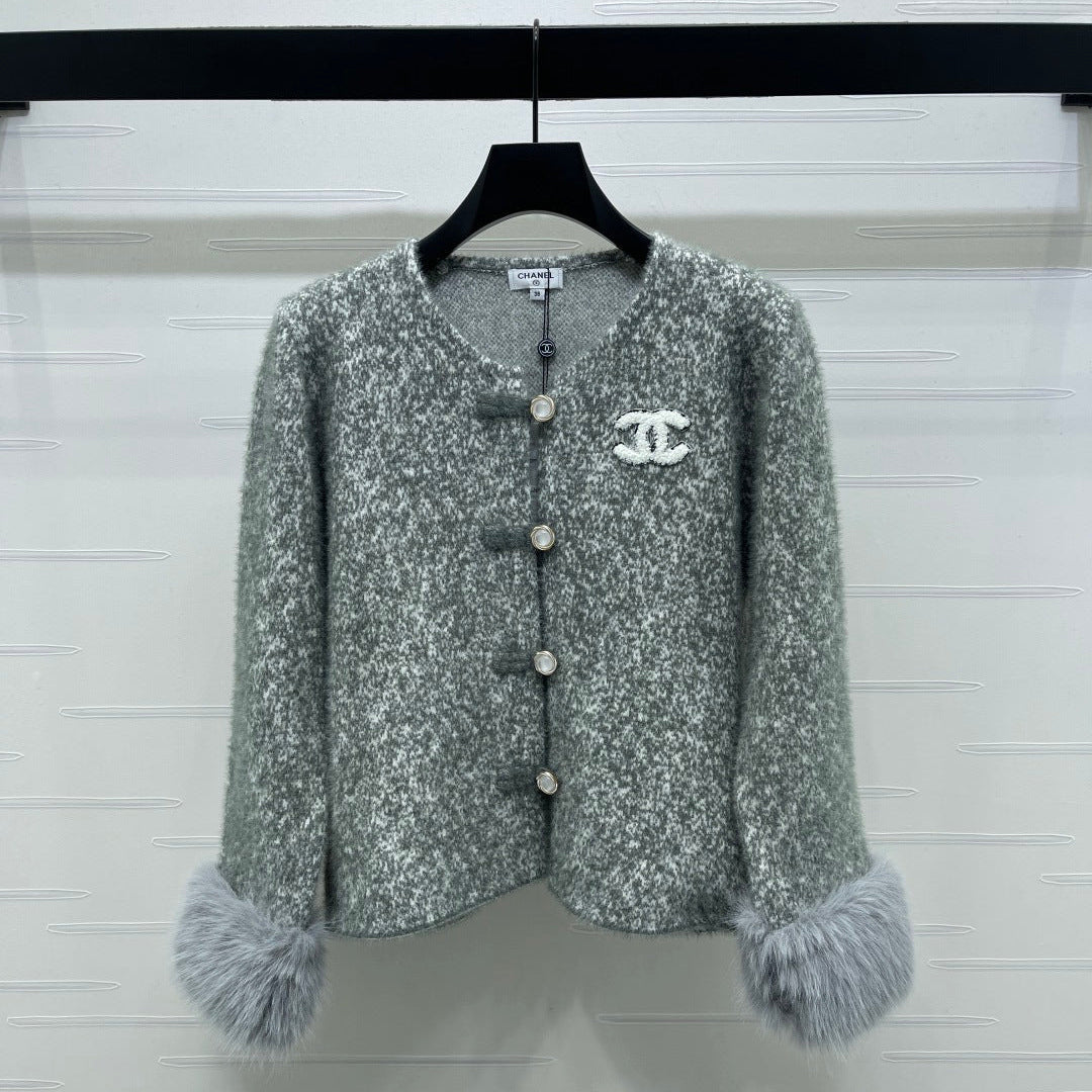 Chanel 2025 Fur-sleeved Crew Neck Cardigan Gray Polyester Wool 319595