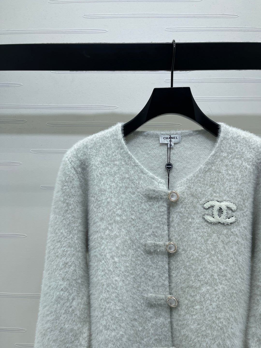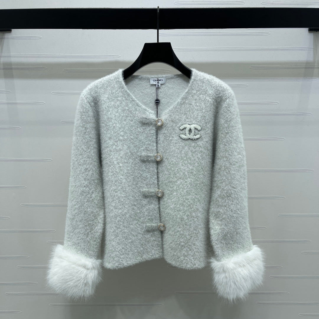 Chanel 2025 Fur-sleeved Crew Neck Cardigan Light Gray Polyester Wool 319594
