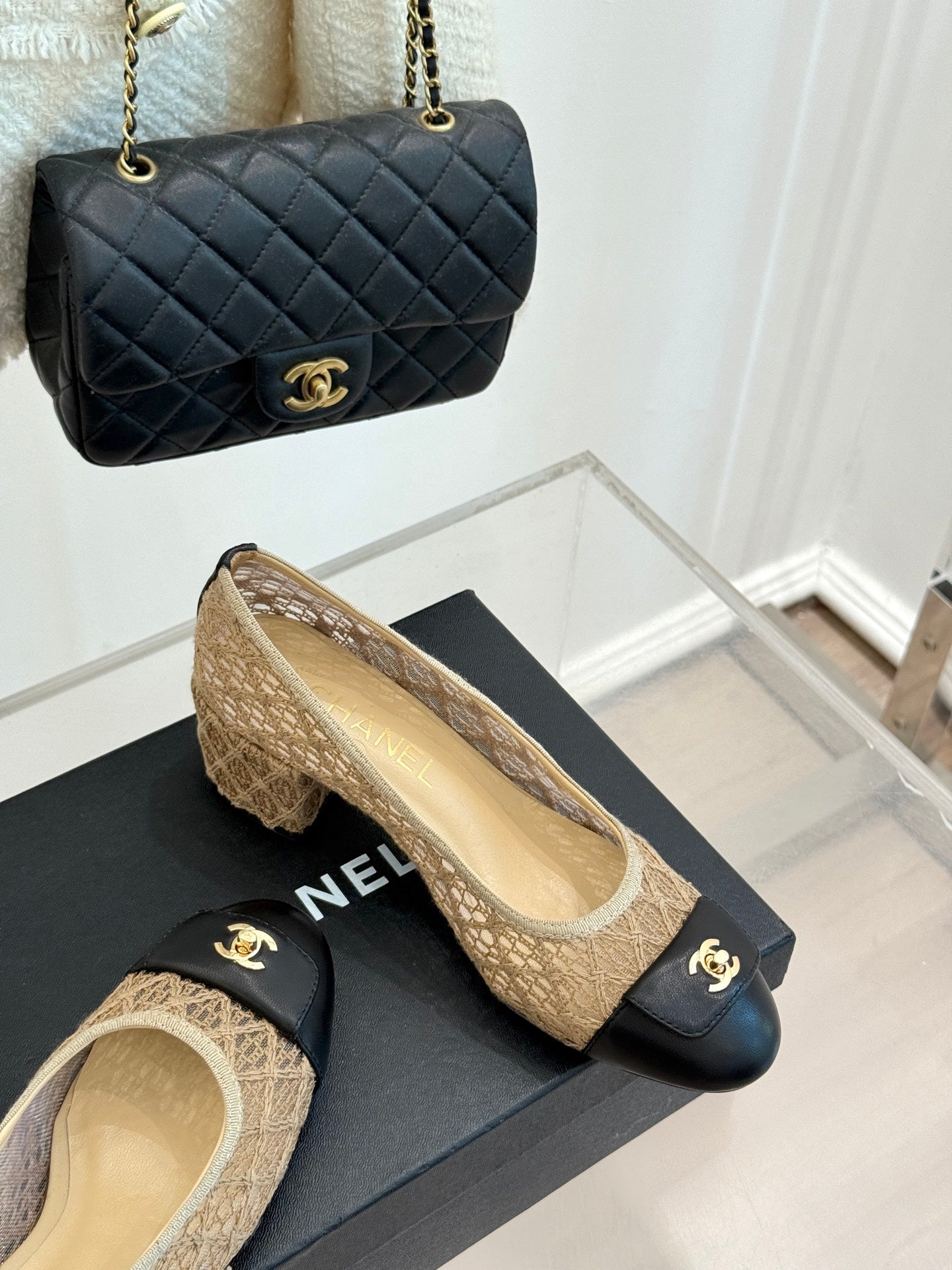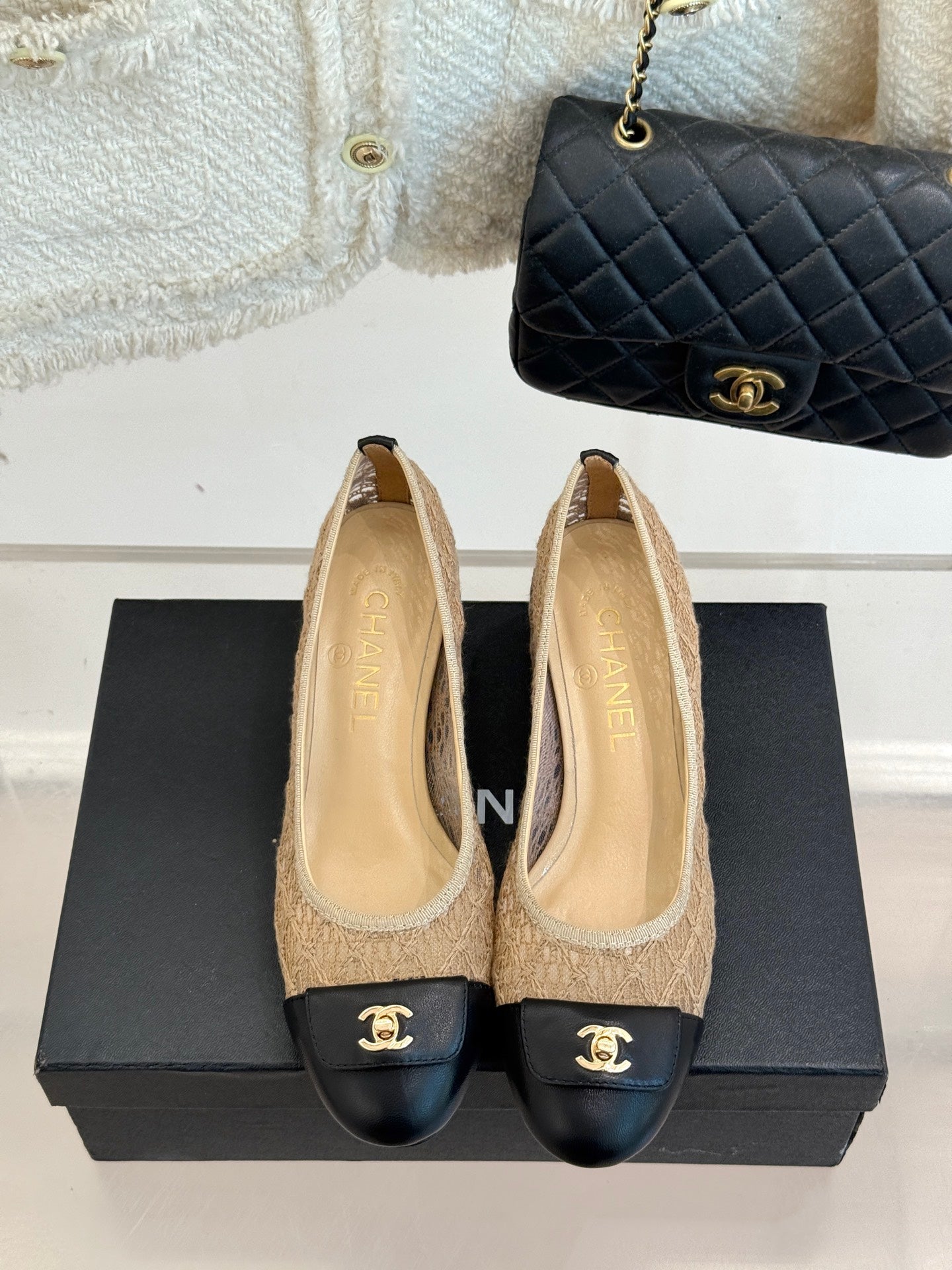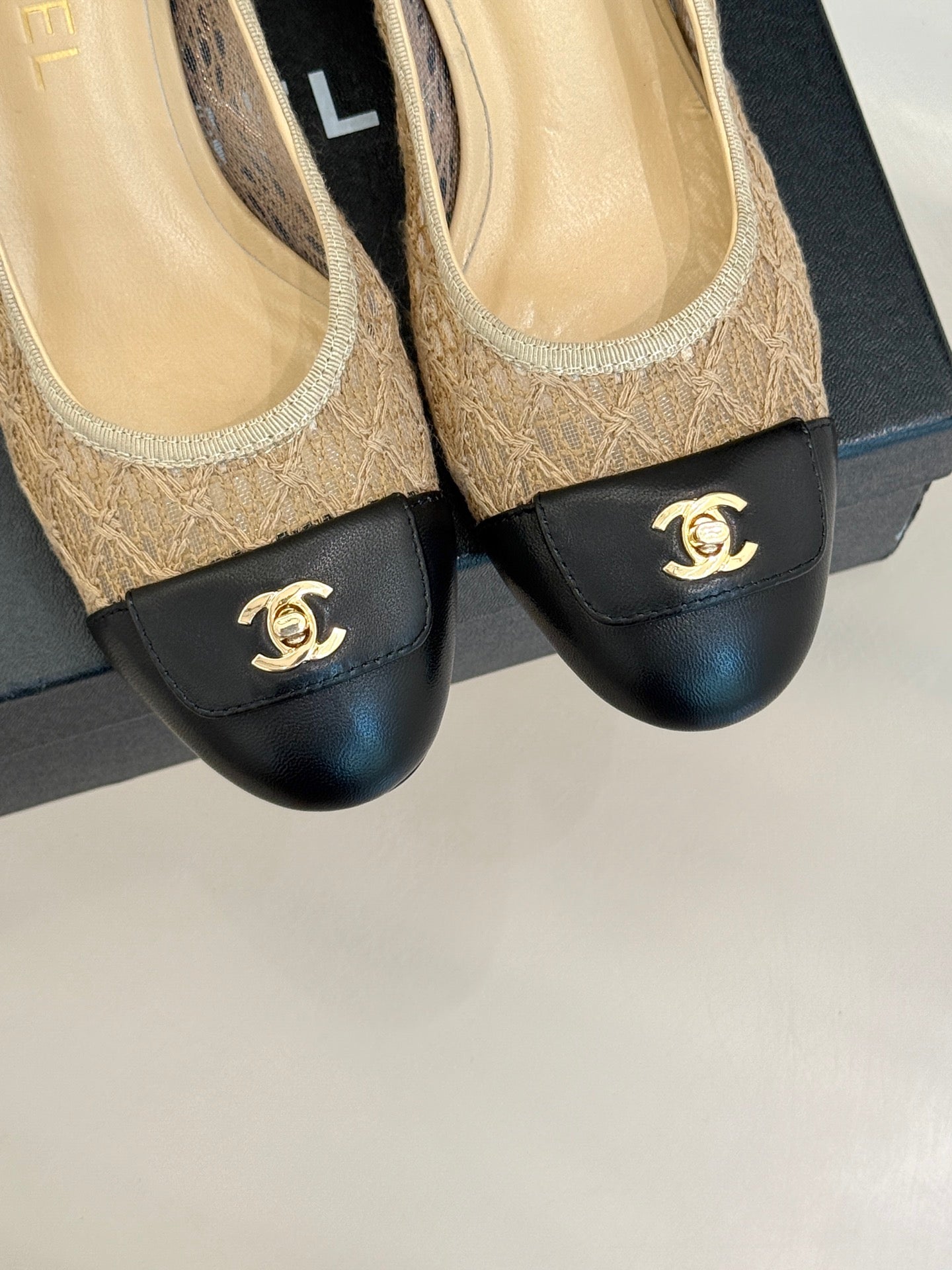 Chanel 25 Ballet Flat 50mm Beige Black Woven Lambskin 473050