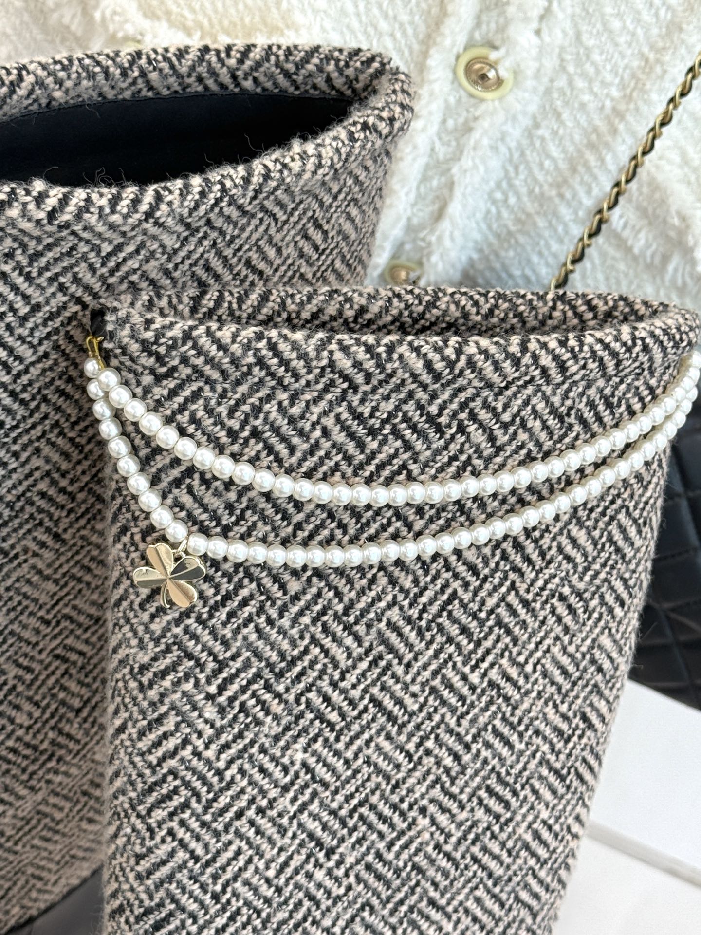 Chanel 25 Four-Leaf Clover Pearls Double C Long Boots Black Grey Woven Sheepskin 465406