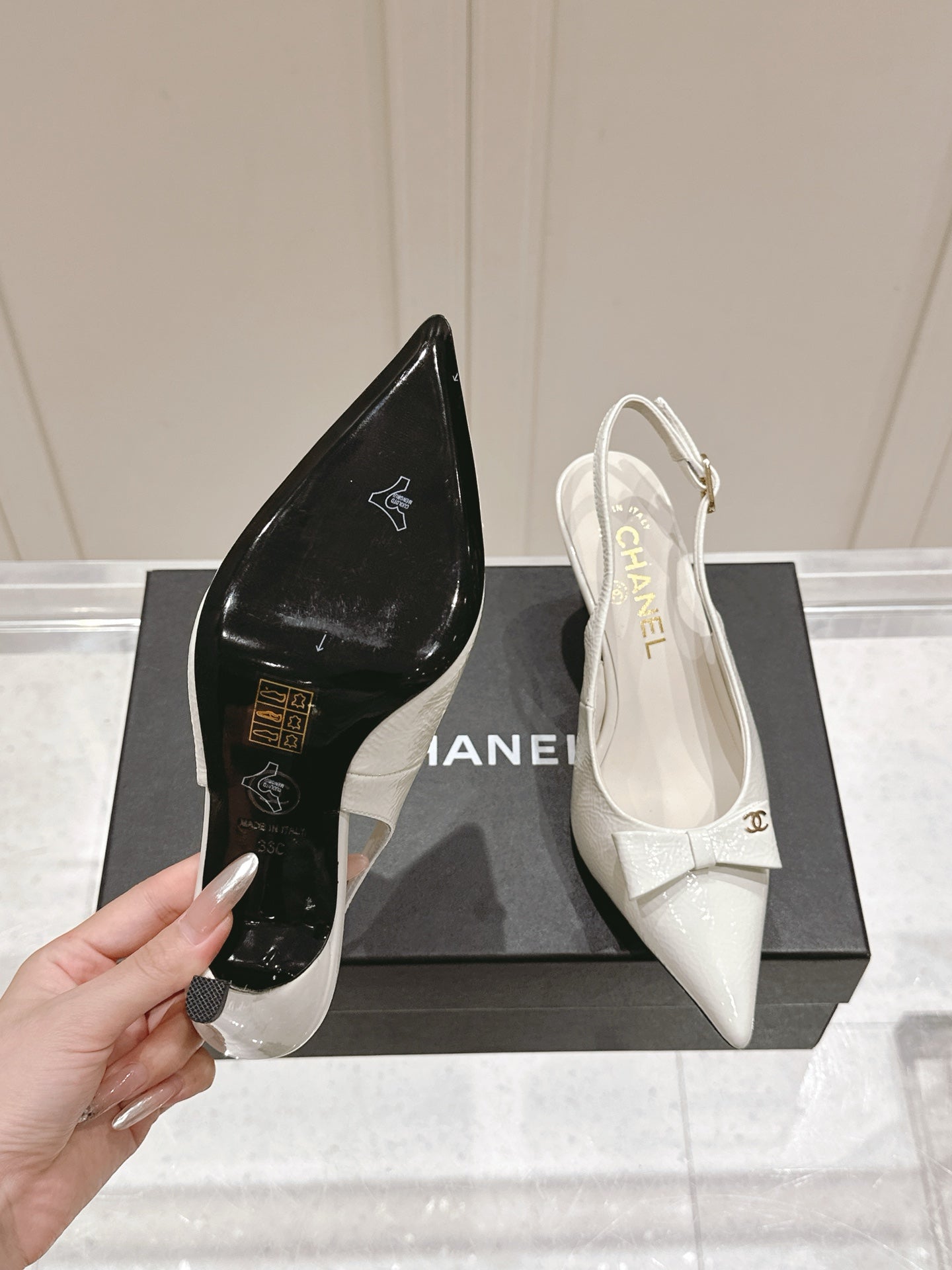 Chanel 25A Slingback White Patent Calfskin 393072