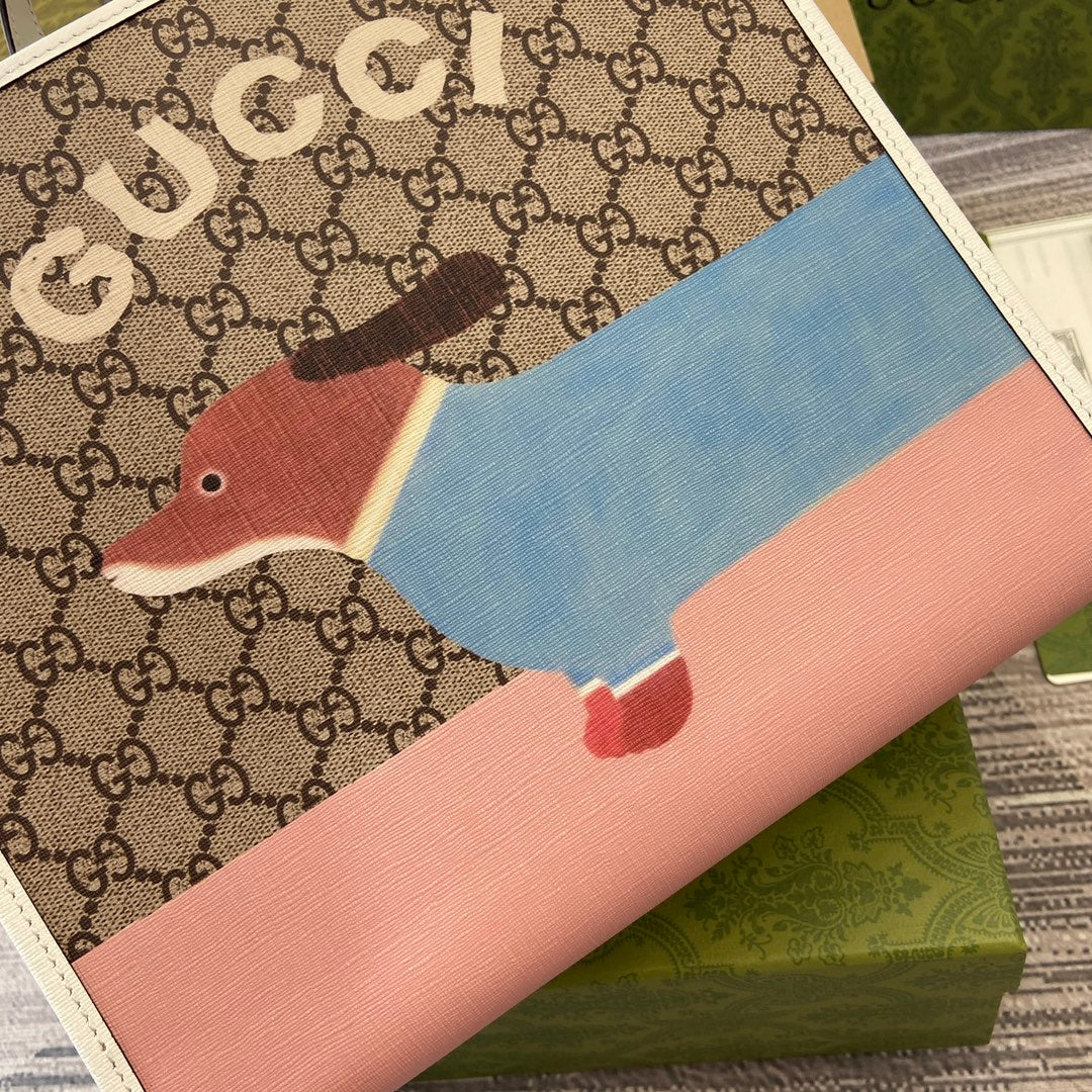 CHILDREN'S PUPPY PRINT TOTE BAG 28 IN BEIGE CANVAS AND WHITE CALFSKIN TRIM
