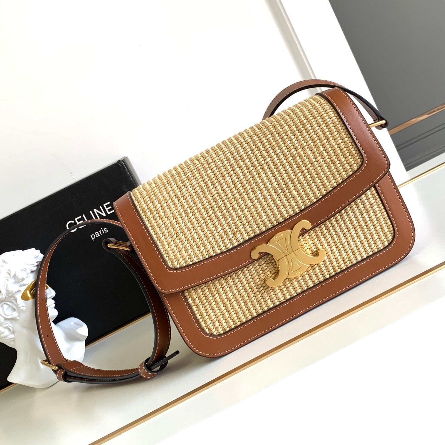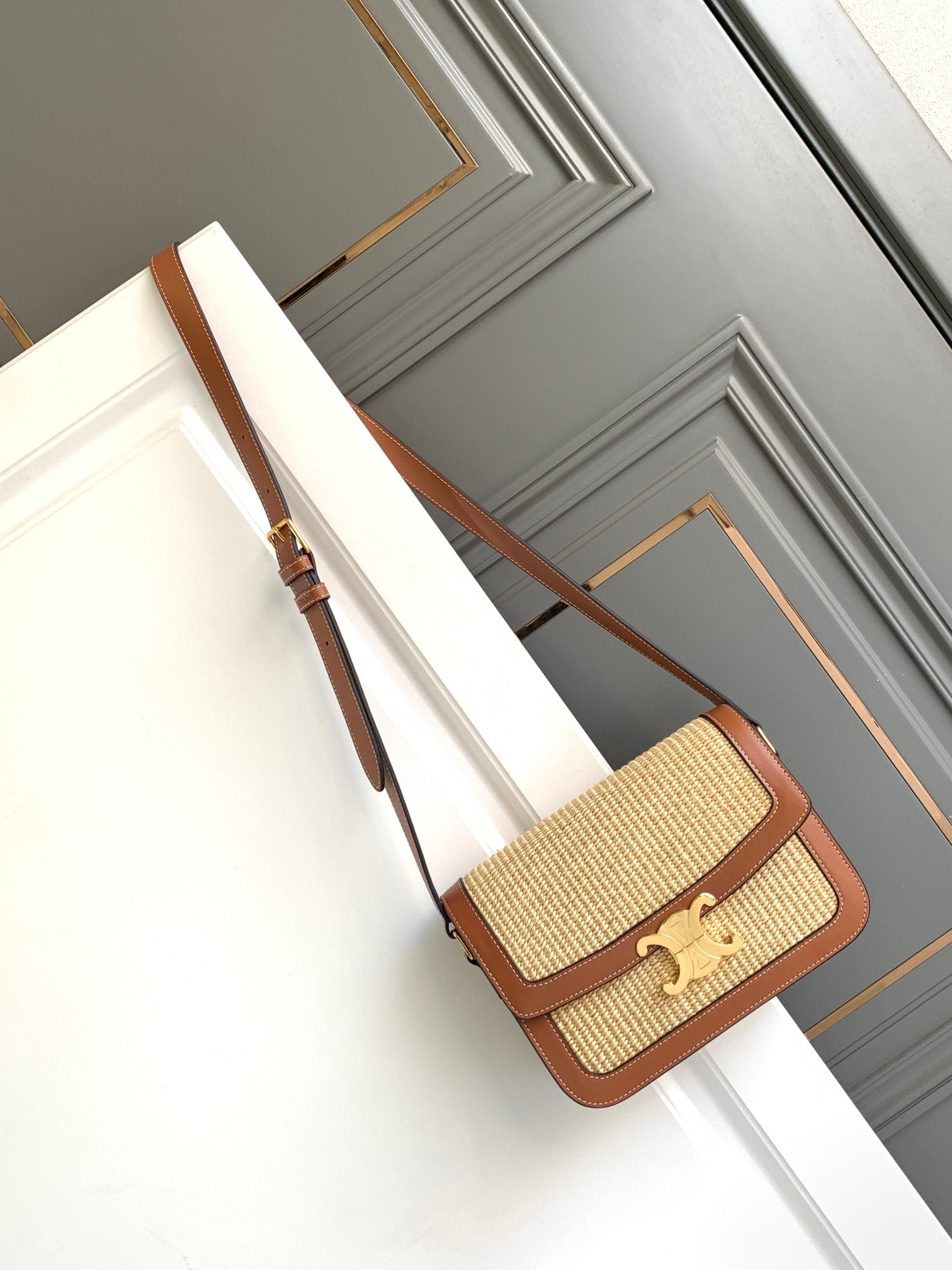 - Color: Beige Textile and Tan leather, Gold hardware