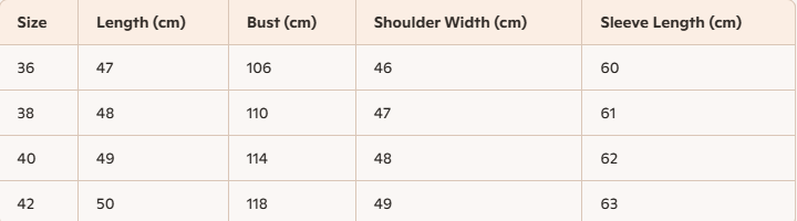 Size: 36, 38, 40, 42
