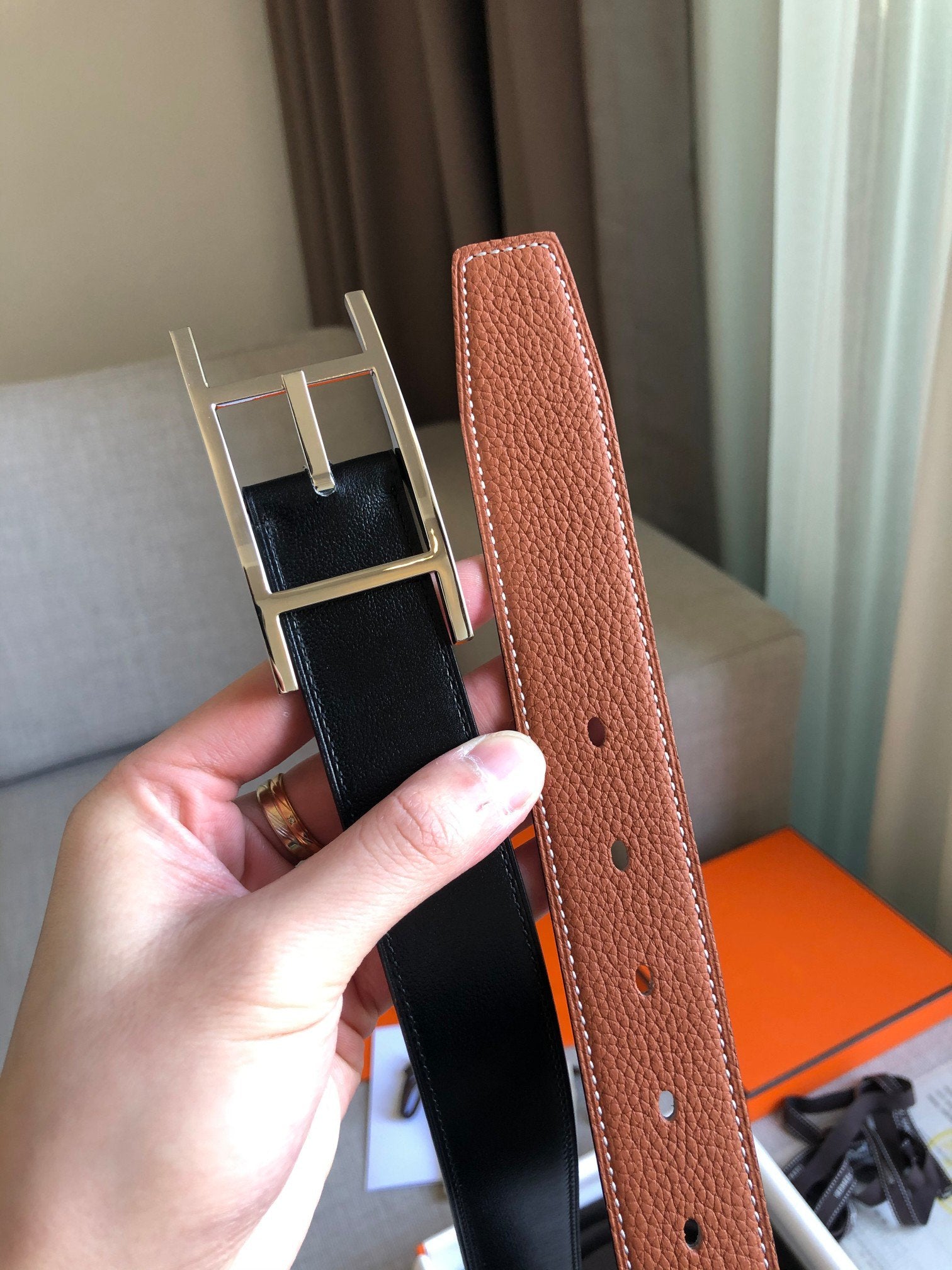 H BELT SILVER BUCKLE BROWN BLACK LEATHER REVERSIBLE 3.2CM