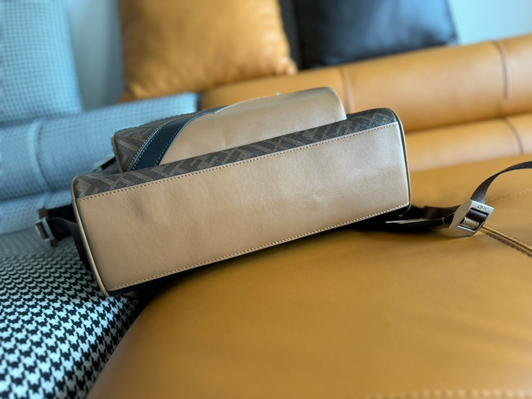 FENDI 44 MINI BACKPACK IN CAMEL BROWN MONOGRAM JACQUARD FABRIC AND CALFSKIN
