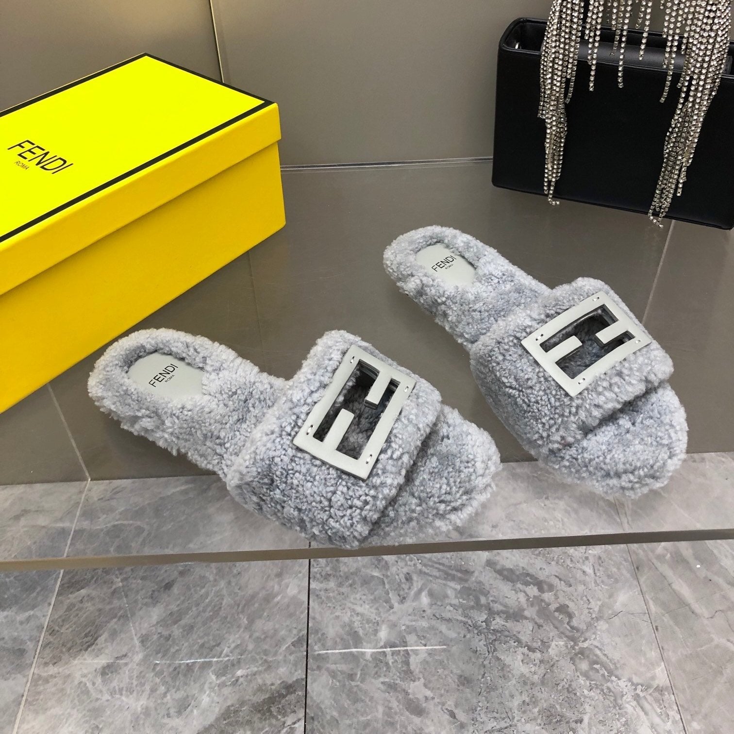 FENDI BAGUETTE SLIDE SLIPPERS IN GREY WOOL