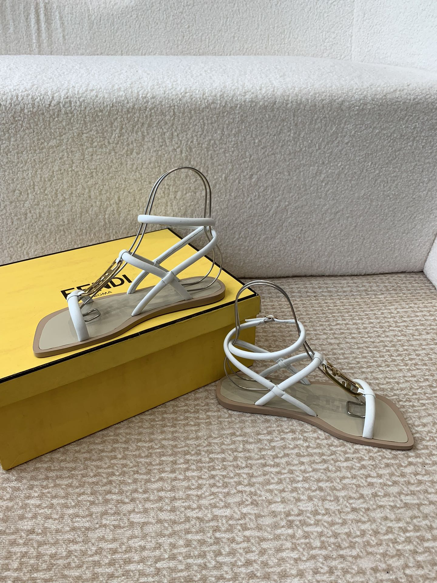 FENDI O'LOCK THONG SANDAL WHITE CALFSKIN WITH GOLD HARDWARE