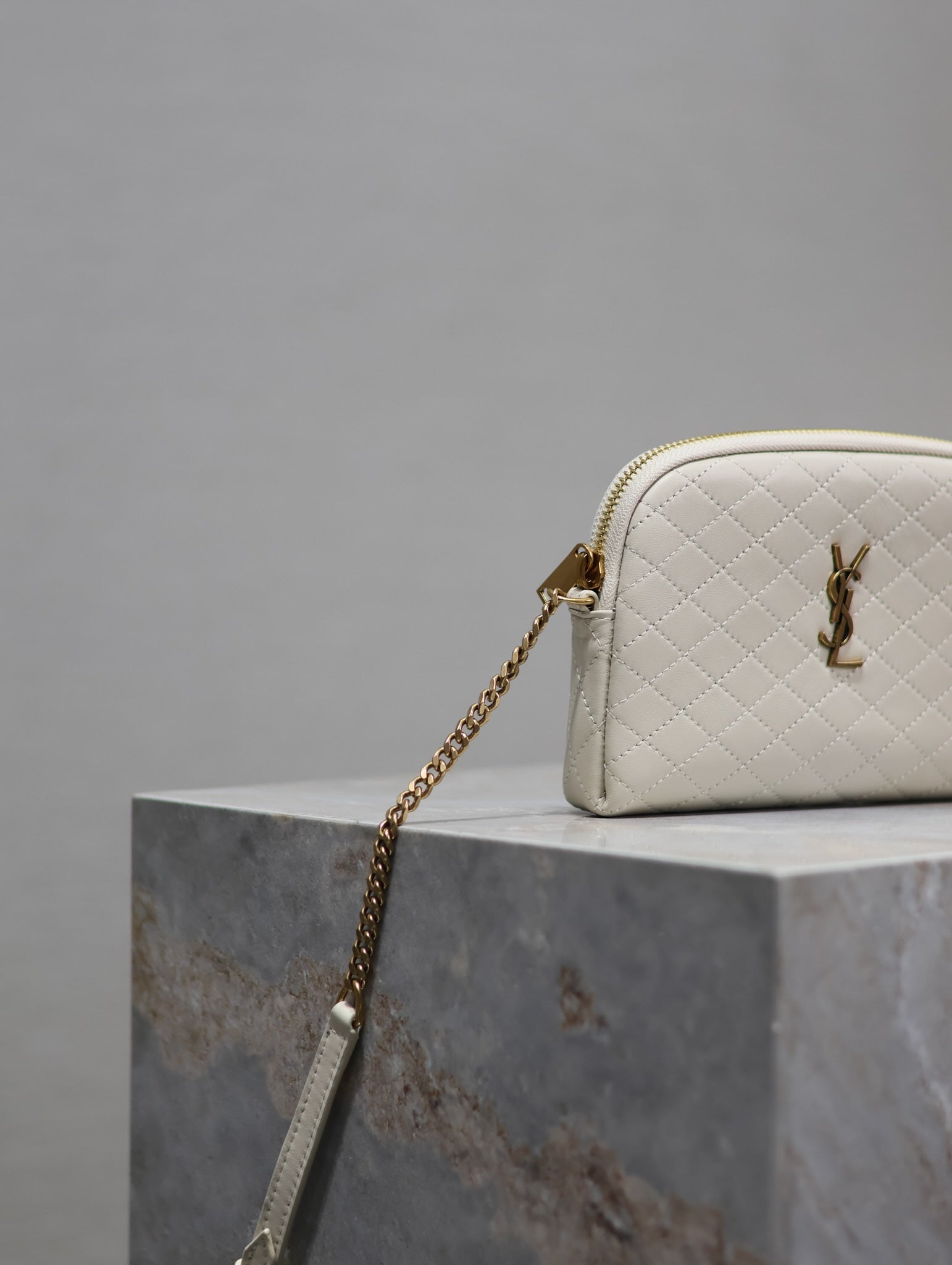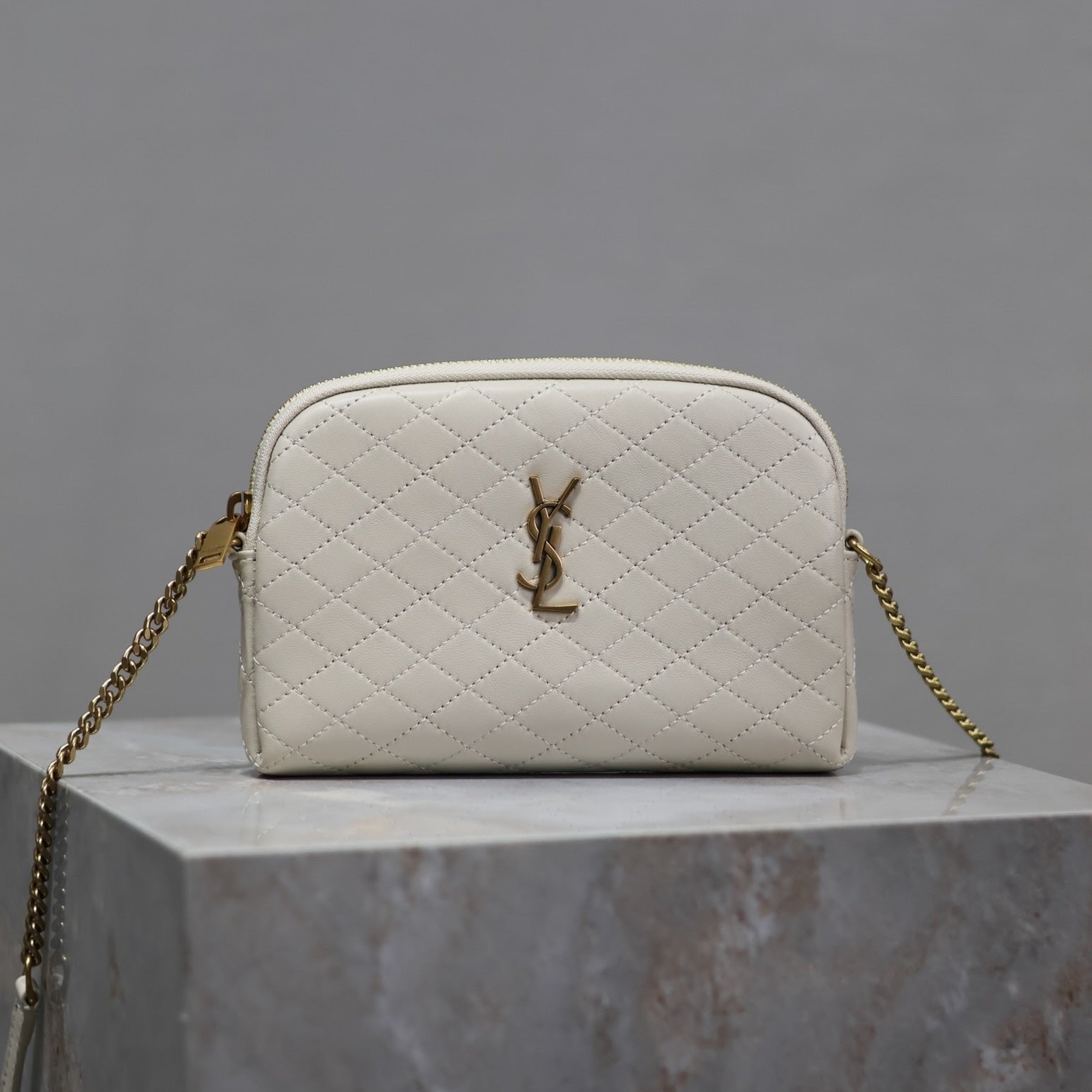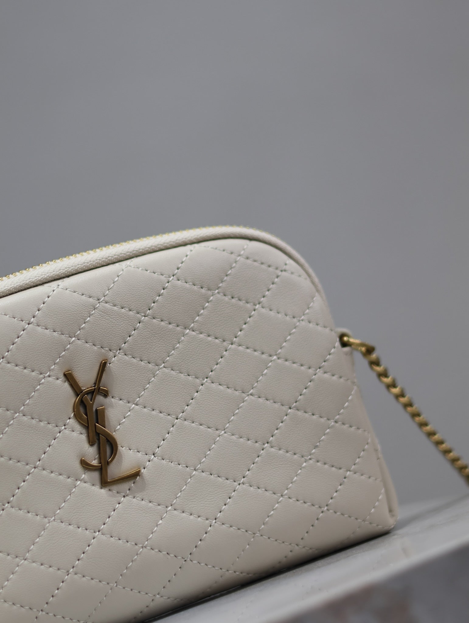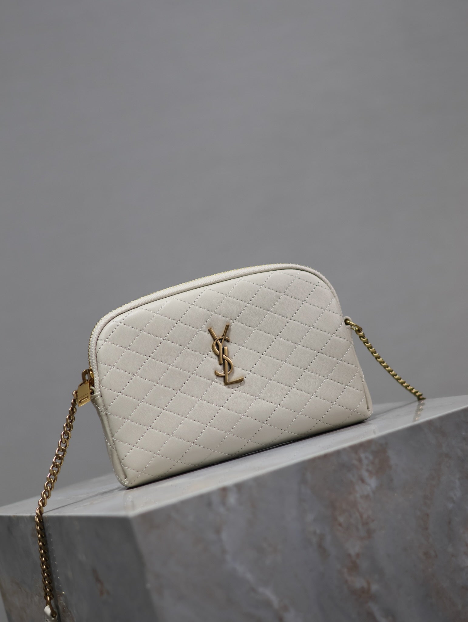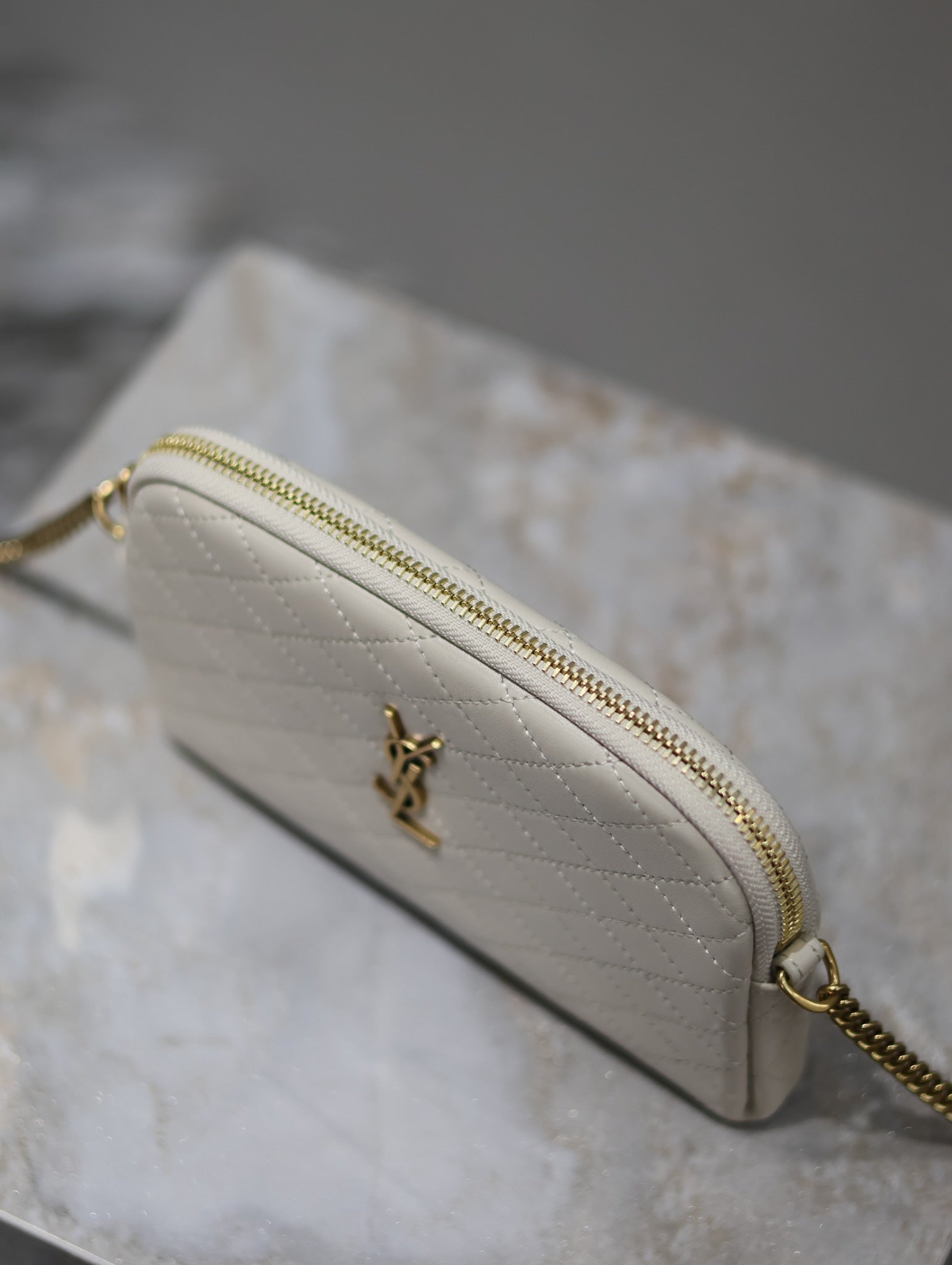 GABY ZIPPED POUCH 19 IN WHITE QUILTED LAMBSKIN GOLD HARDWARE