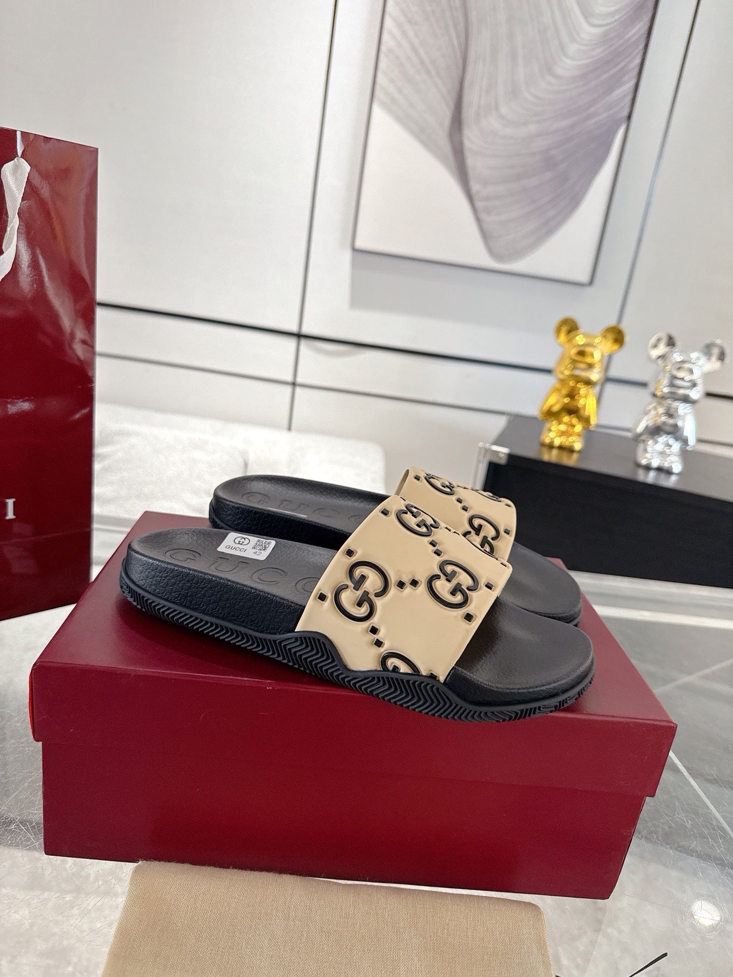 GC GG Slide Sandal Black Beige Rubber 292418