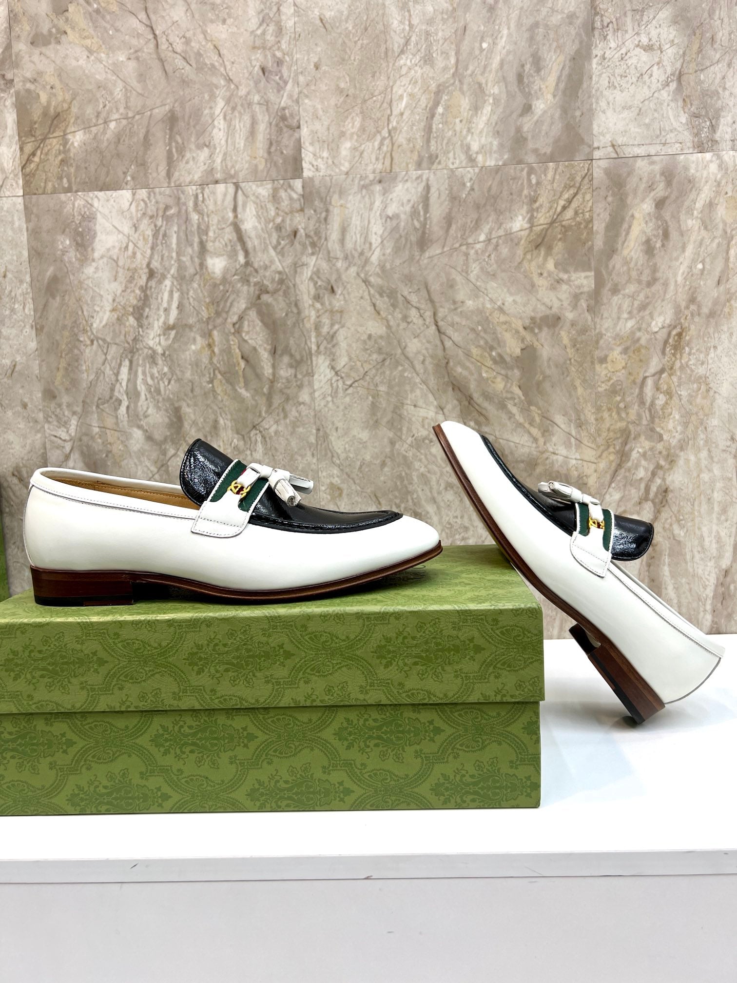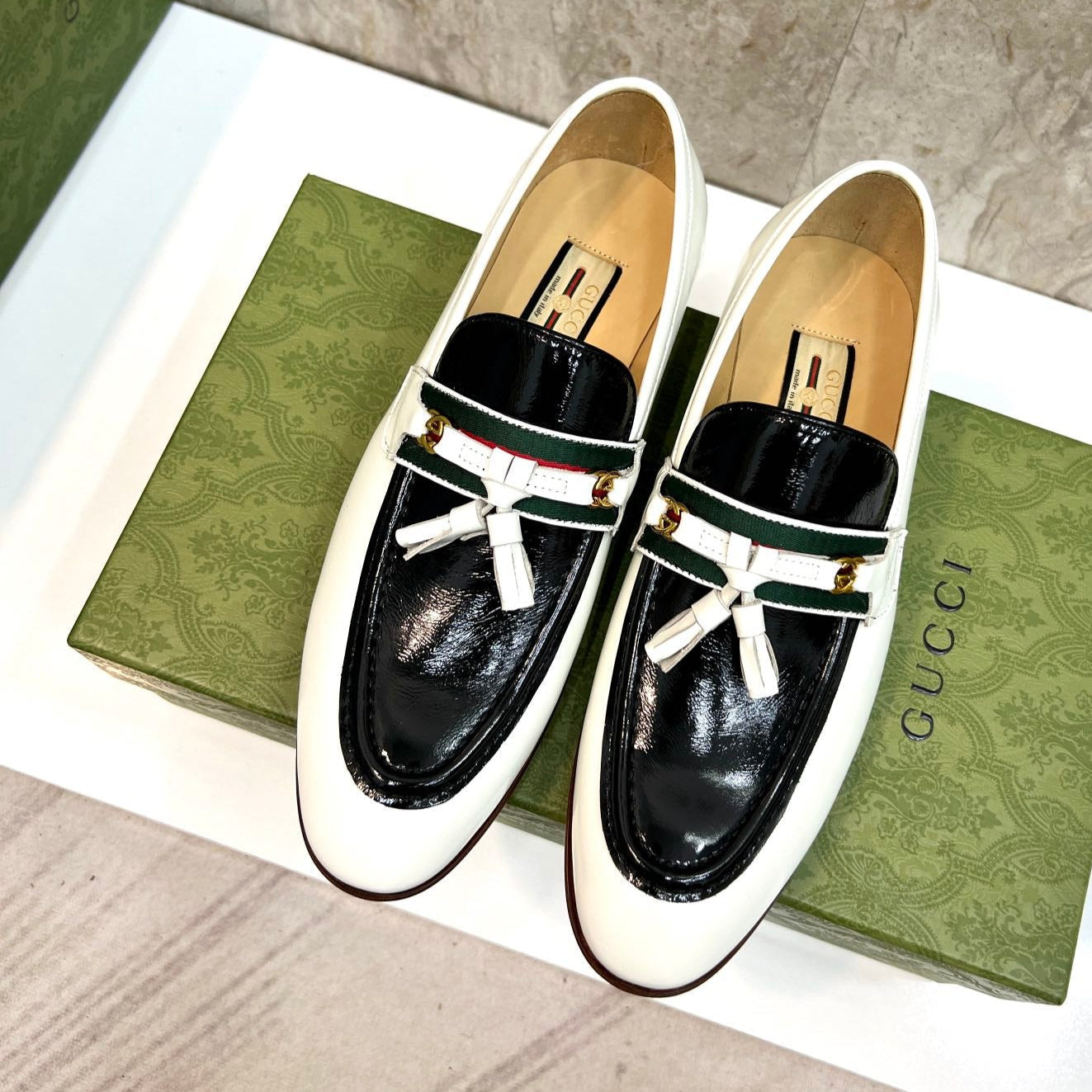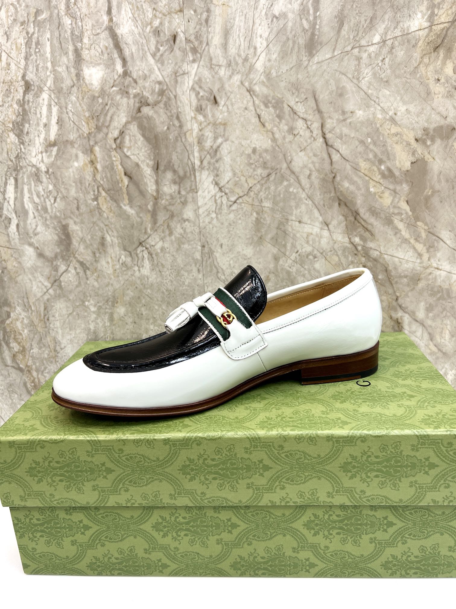 GG Men's Tassel Loafer White Black Patent Leather 548747