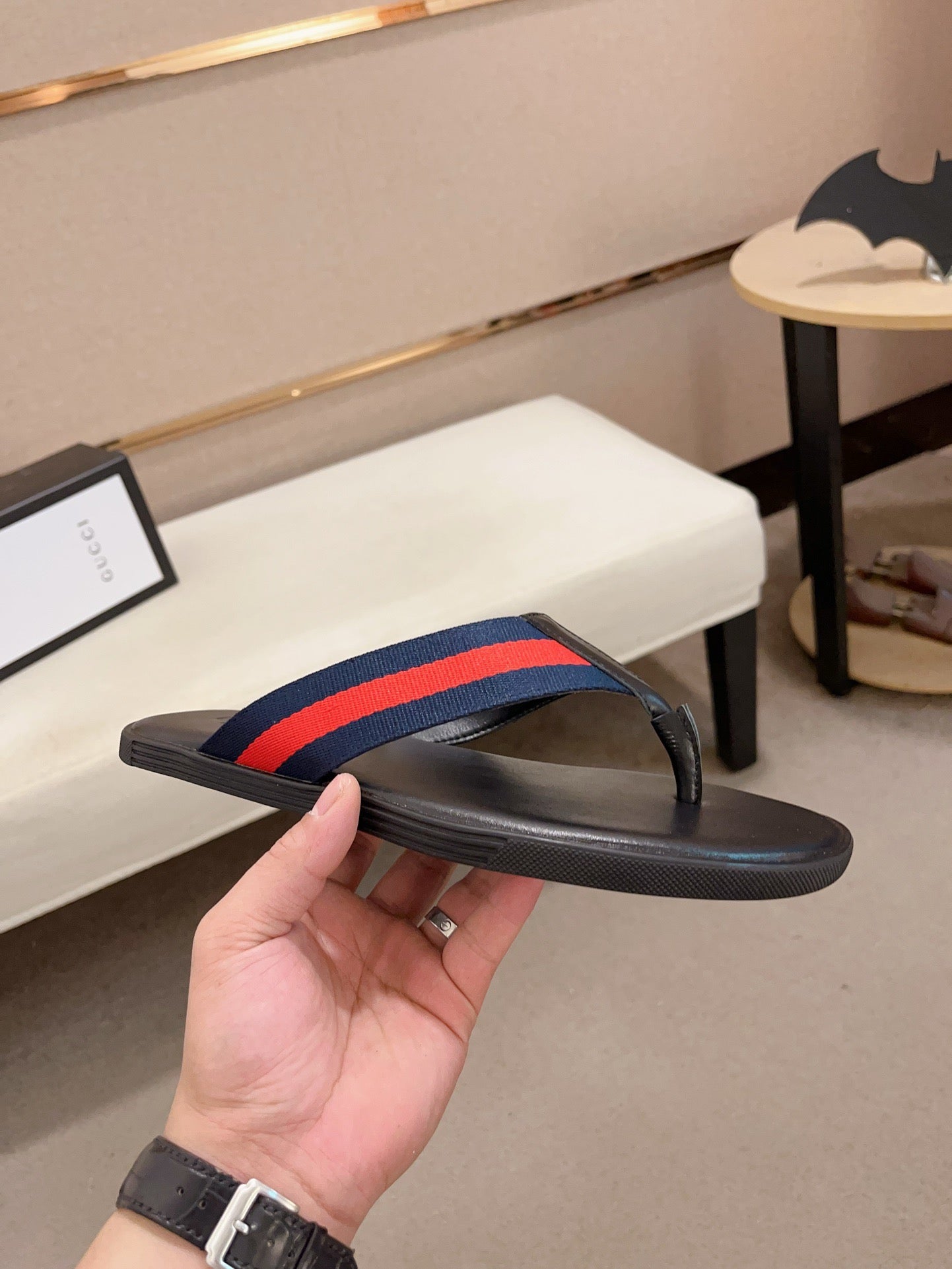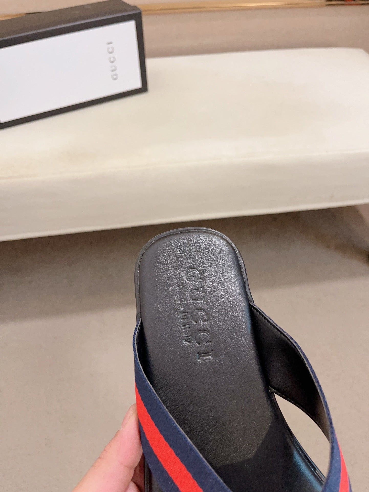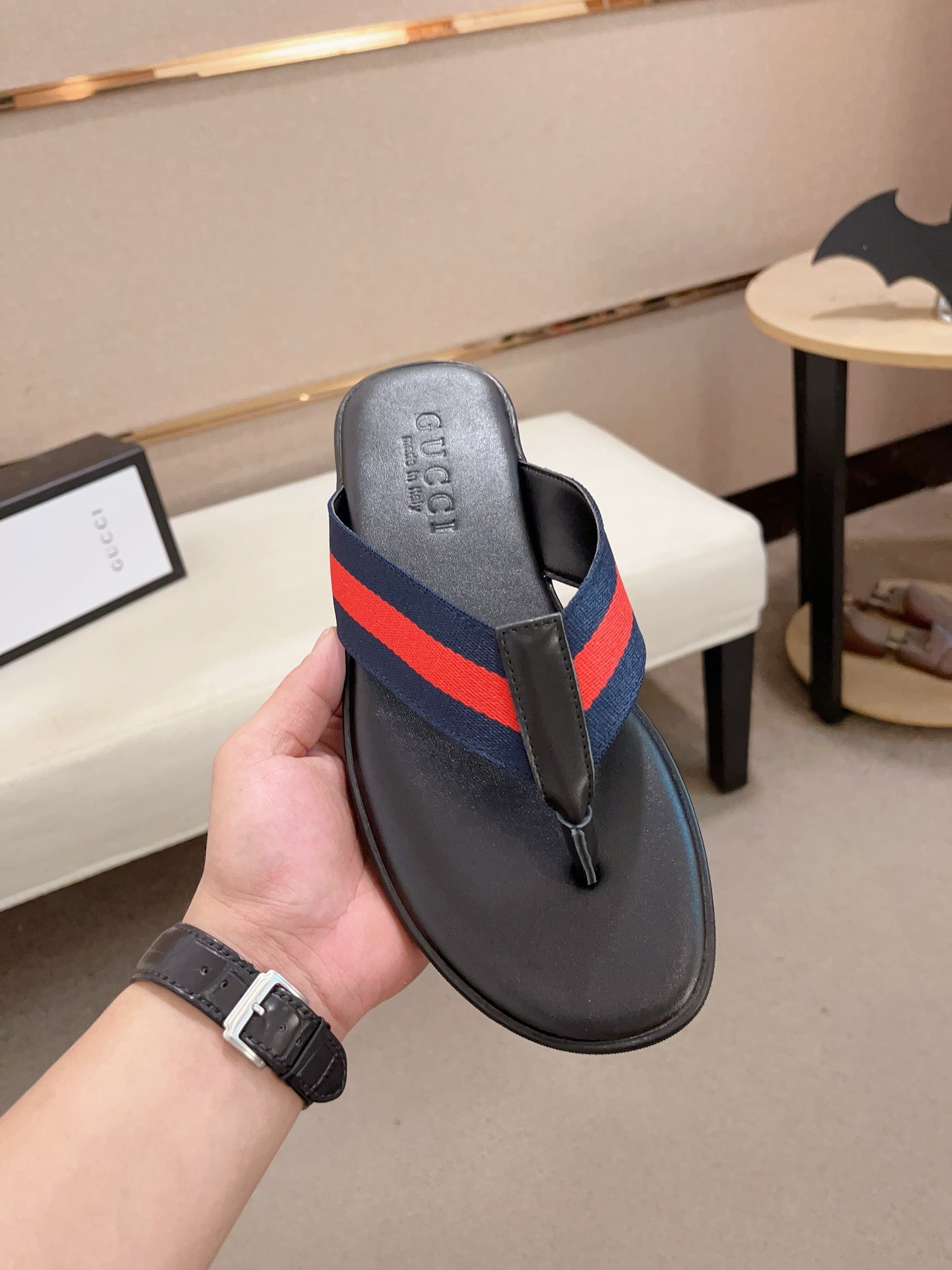GG Men's Thong Web Black Blue Cowhide 554610