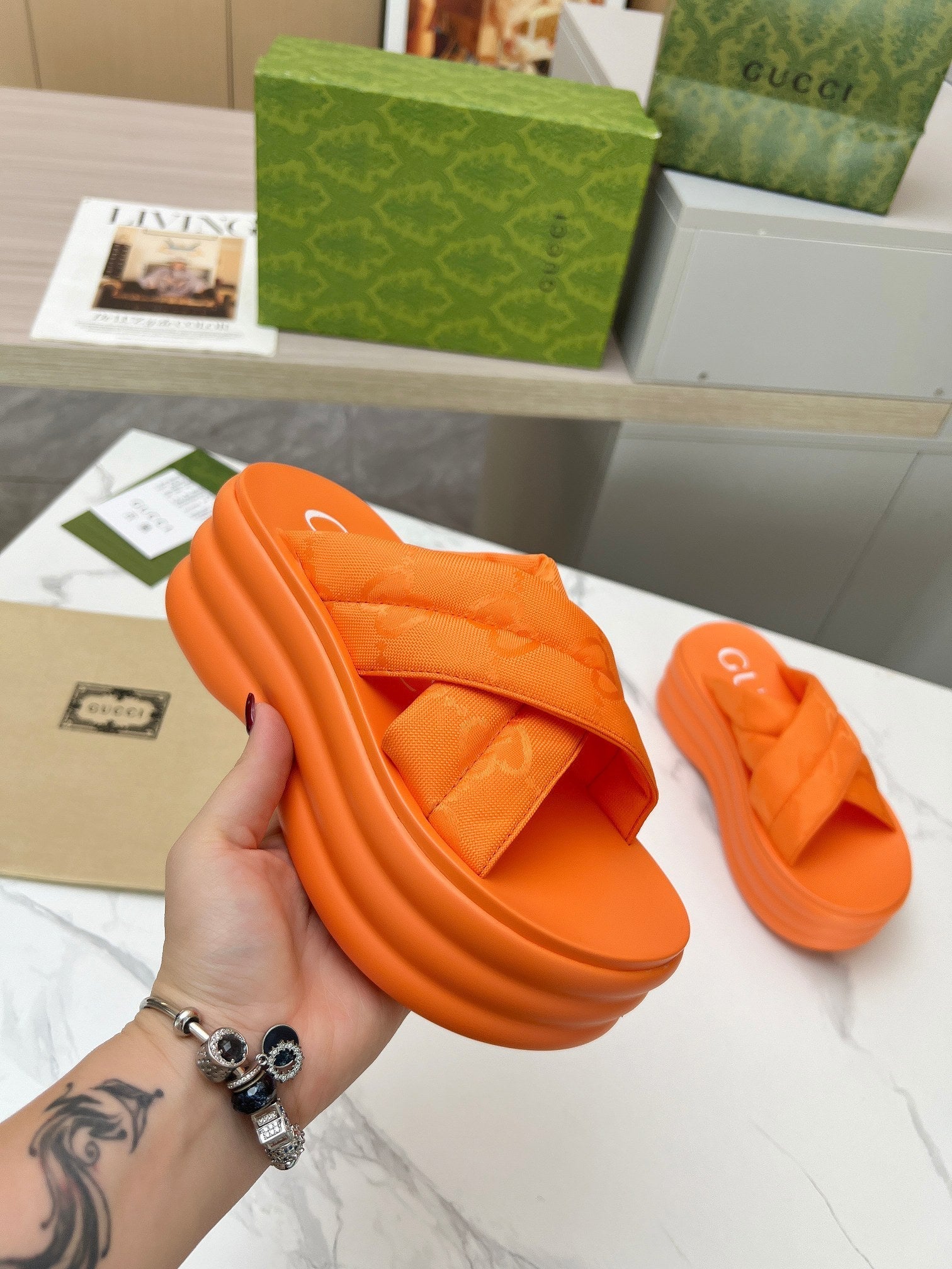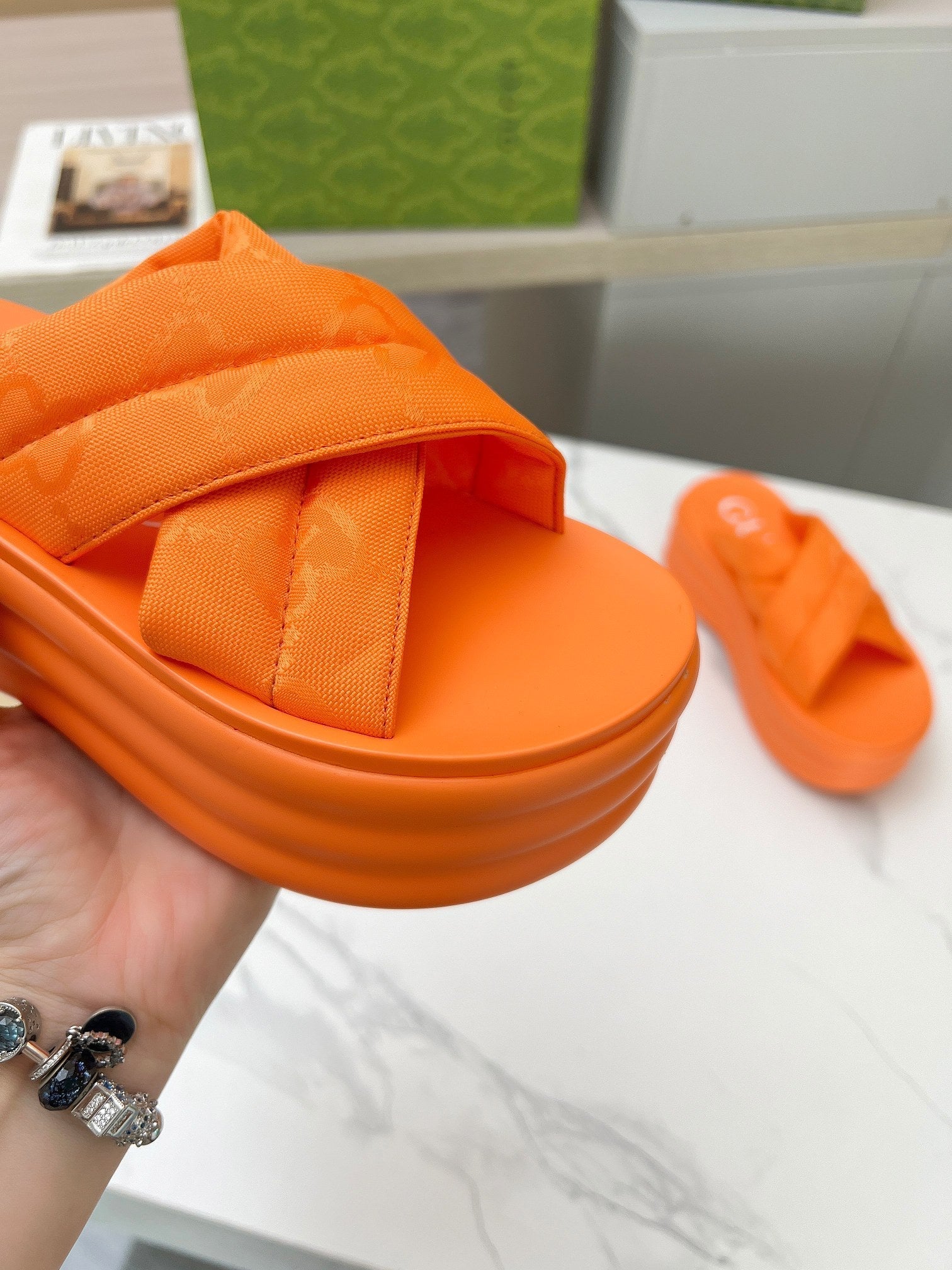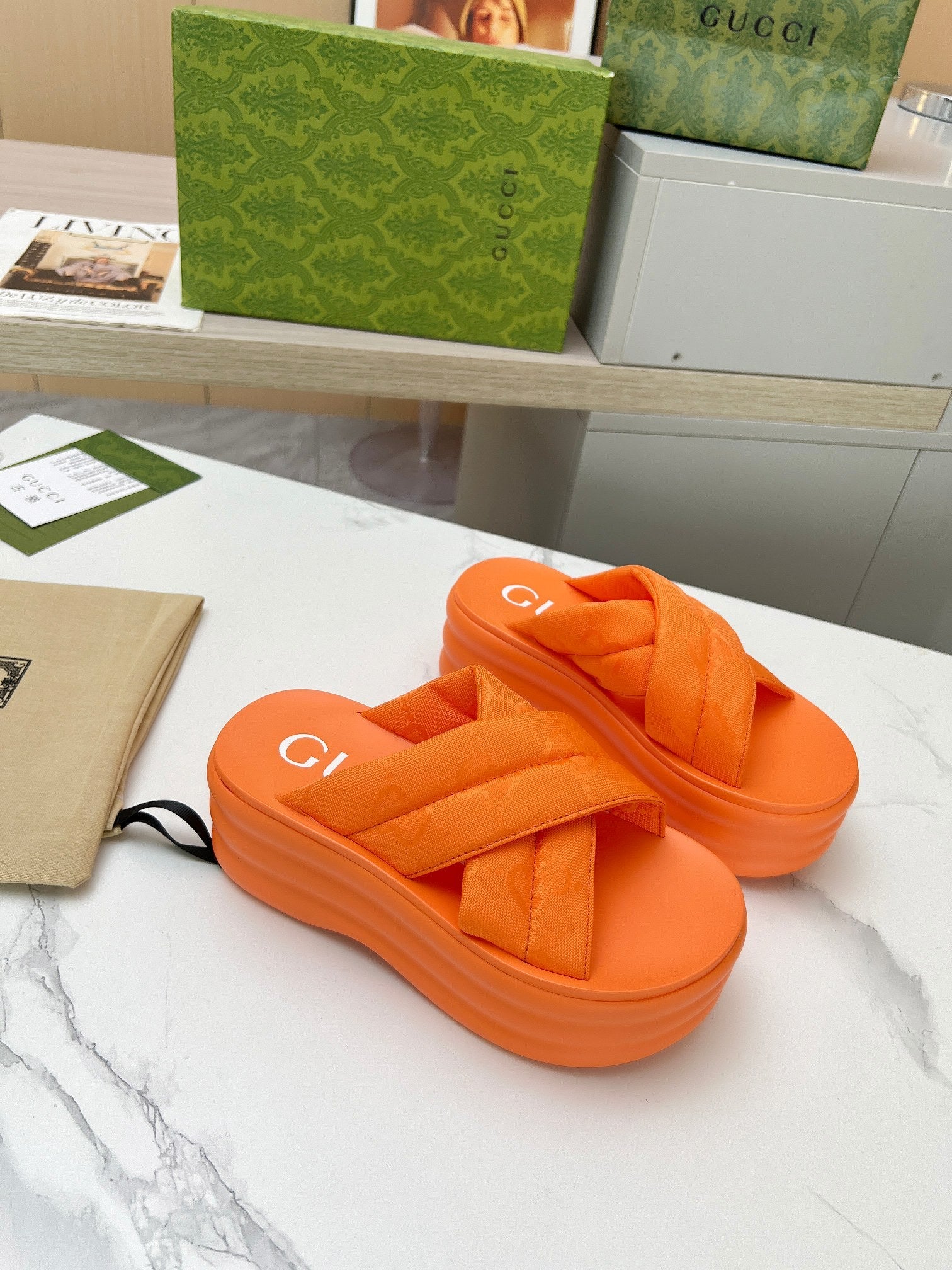 GG waterproof platform slippers orange fabric