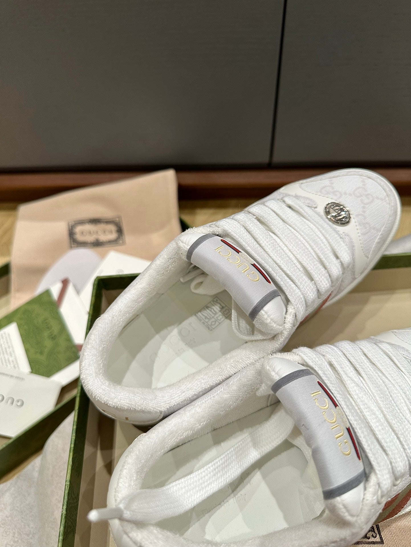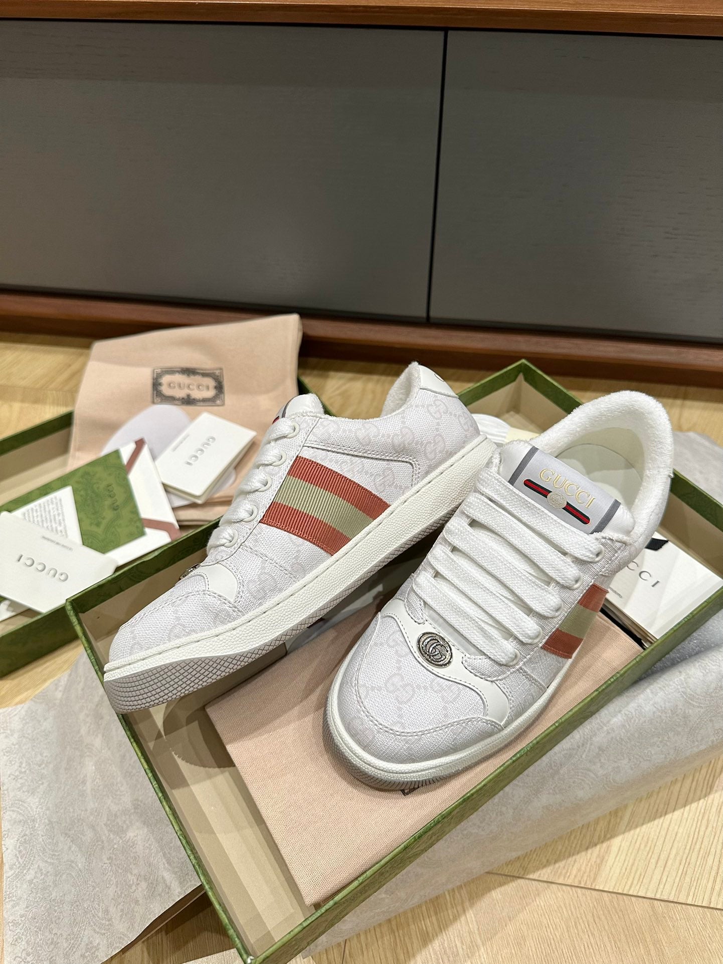 GG WOMEN'S SCREENER TRAINER LIGHT GRAY CALFSKIN