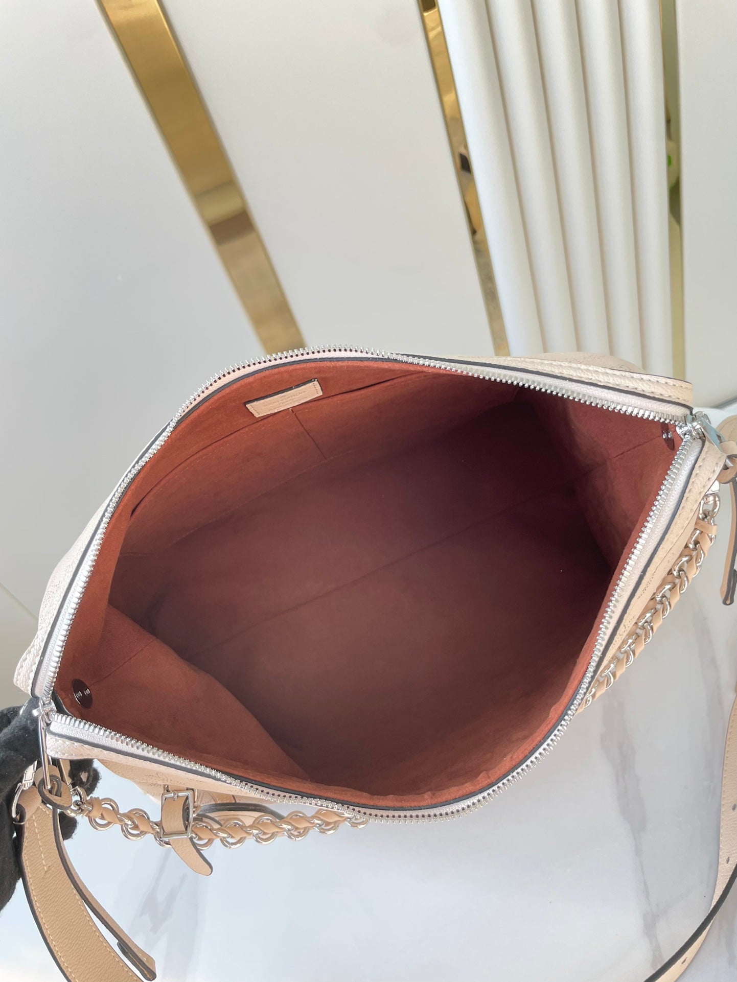 HAND IT ALL MM 32 IN CREAM MONOGRAM PERFORATE CALFSKIN SILVER HARDWARE