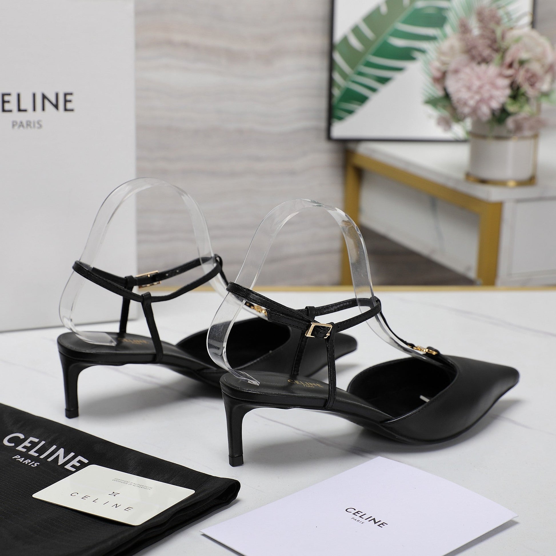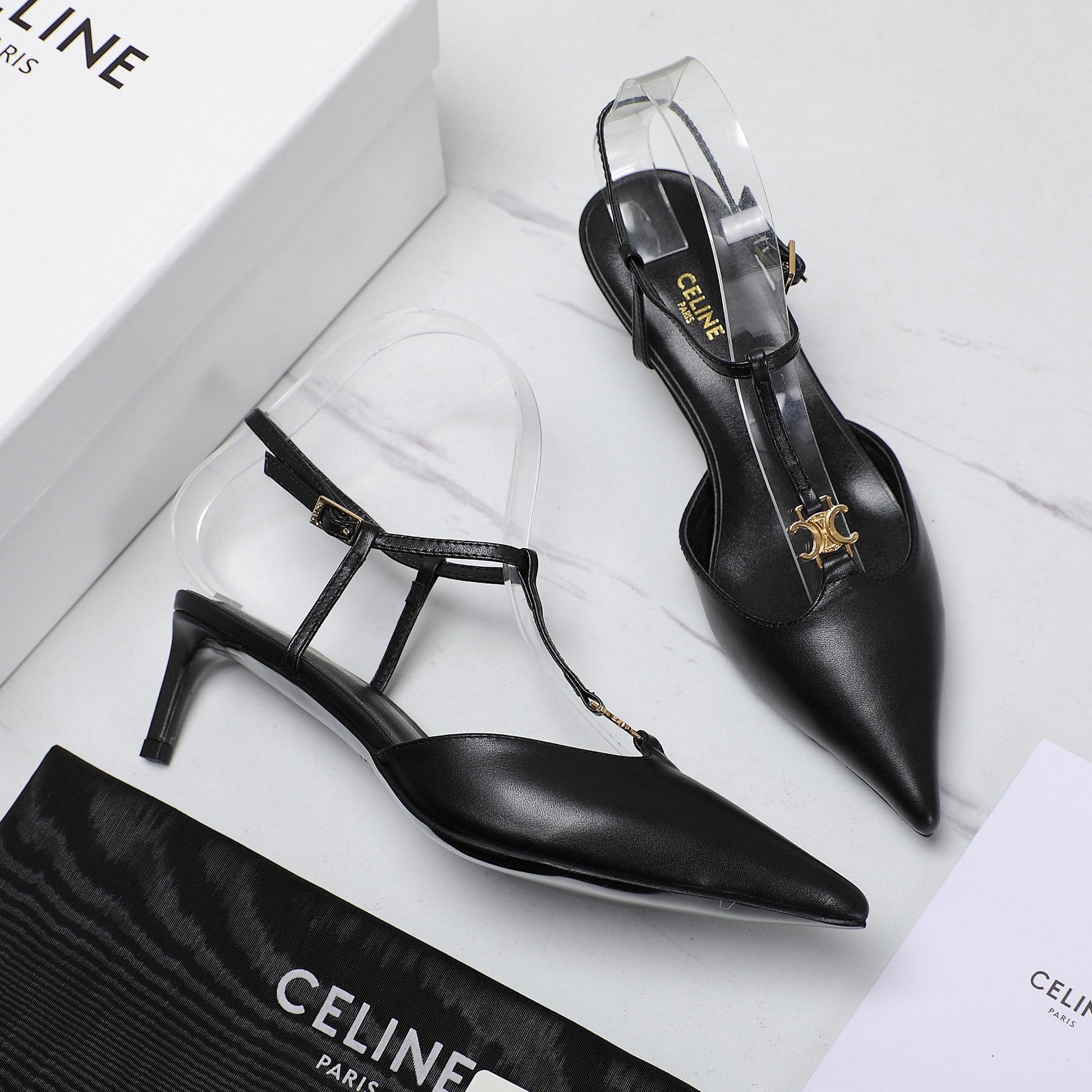 HIGH 5 CM SLINGBACK IN BLACK CALFSKIN WITH GOLD LOGO