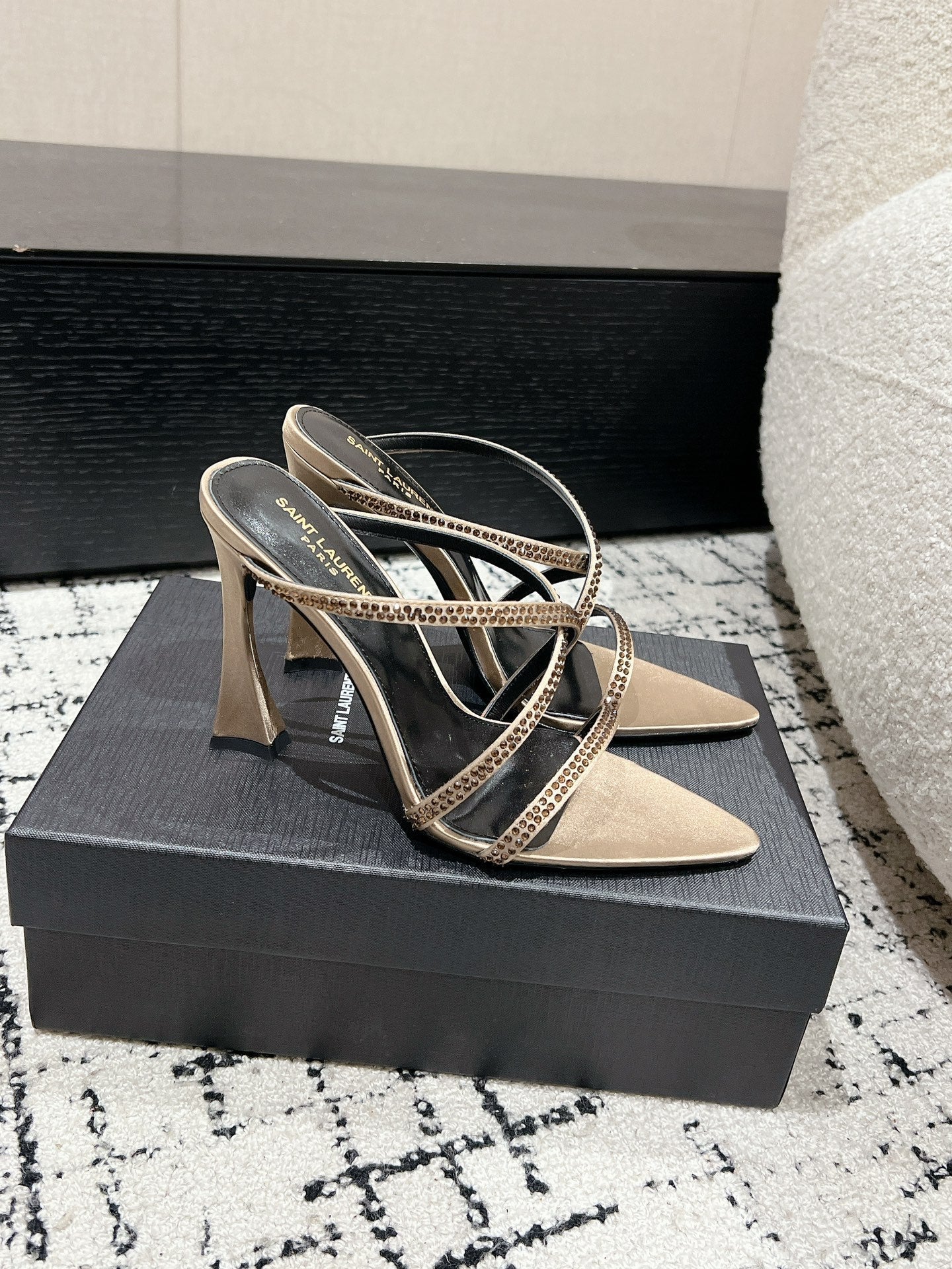 HIGH CRYSTAL STRAP SANDALS IN BOUTIQUE BEIGE SILK