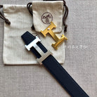 HM BELT BUCKLE & REVERSIBLE BLACK LEATHER STRAP 38MM SILVER HARDWARE