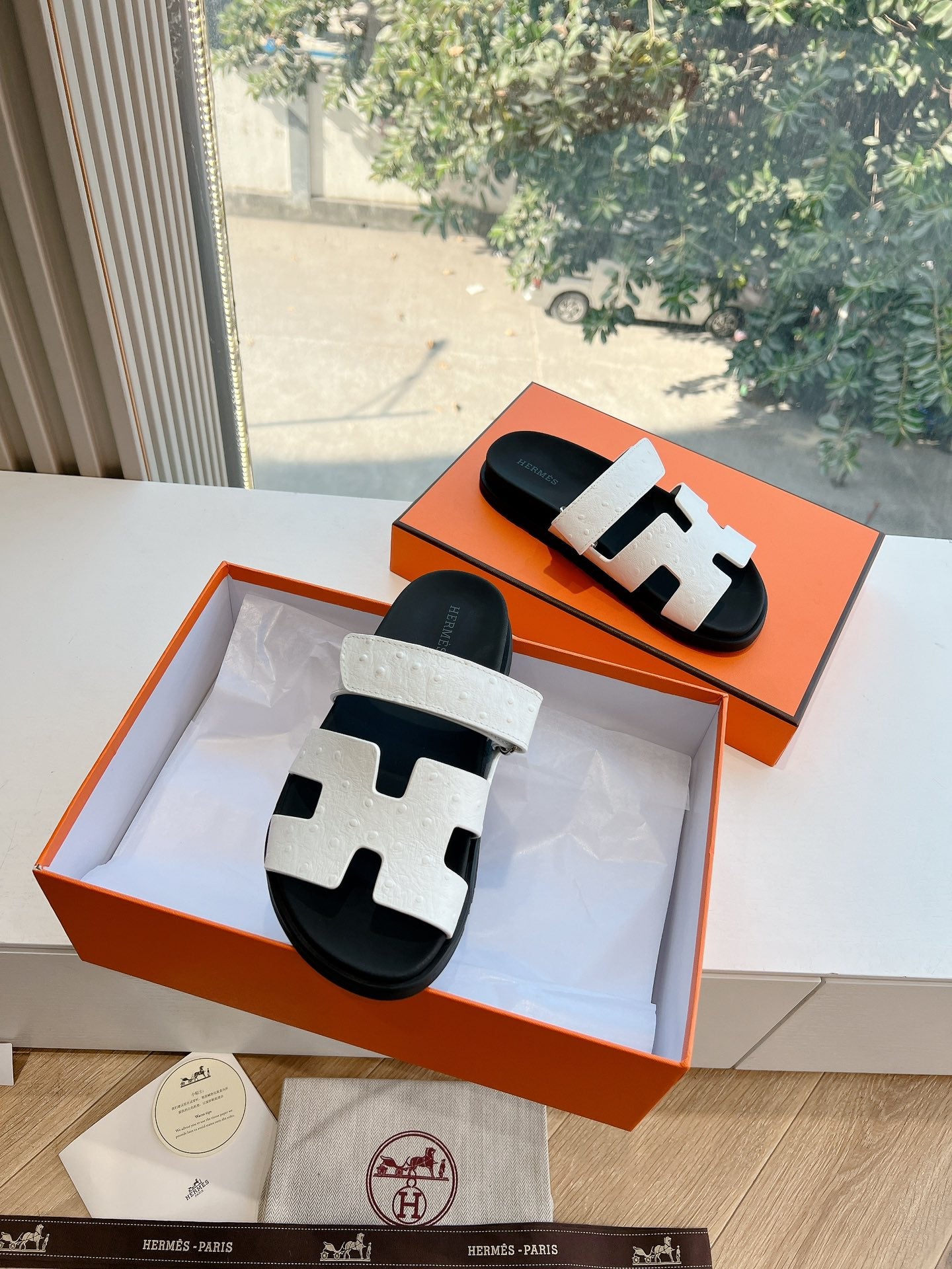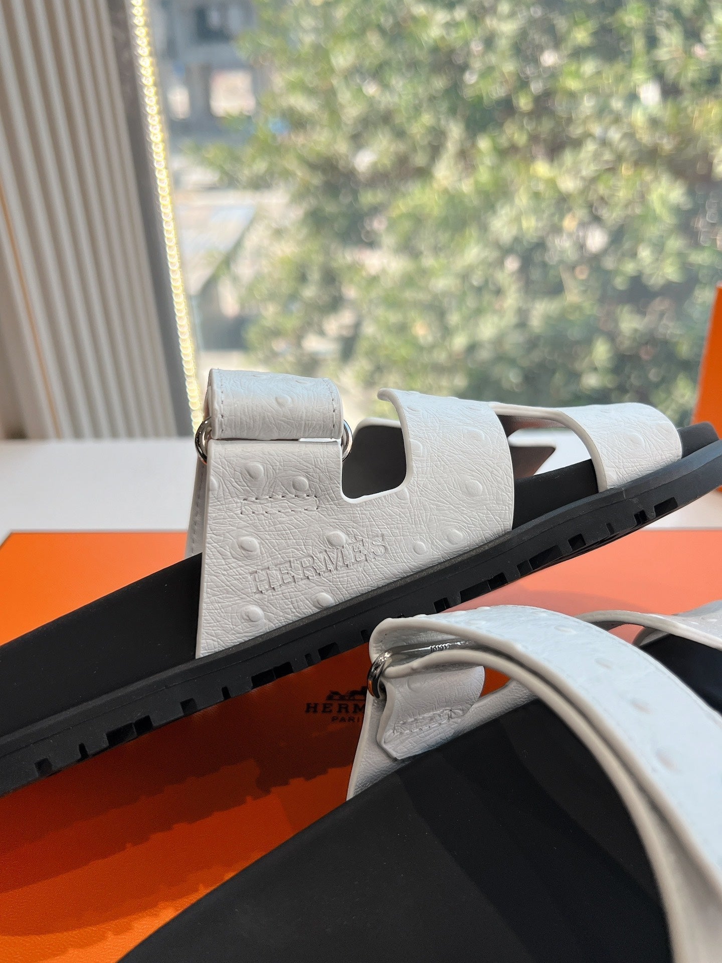 HM Chypre Sandal White Ostrich Leather 202801