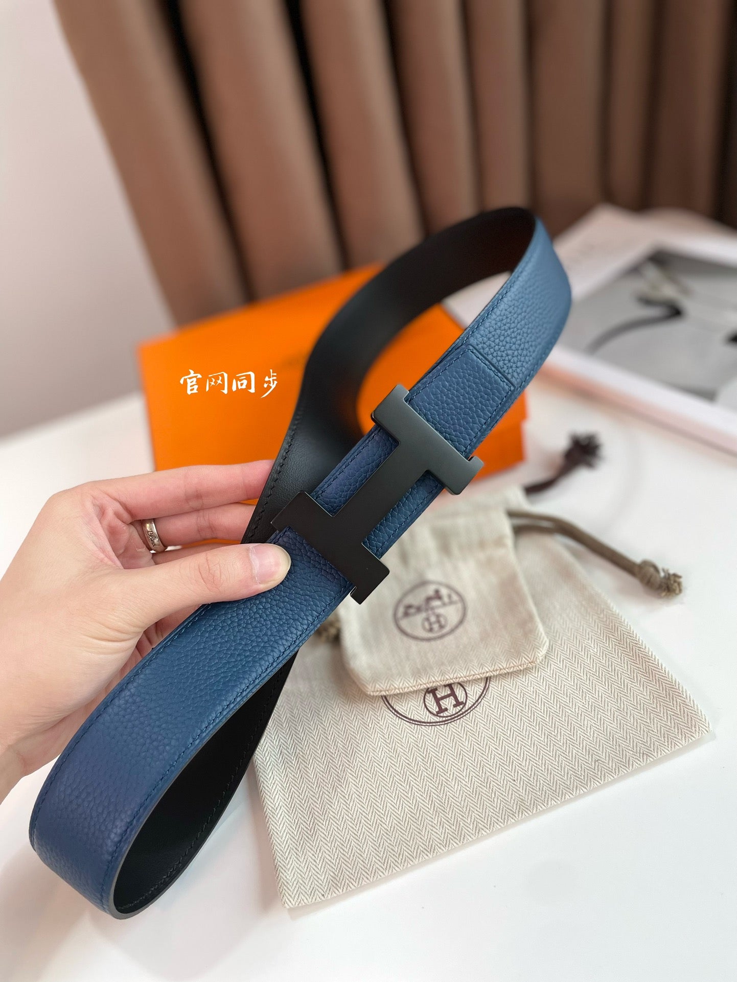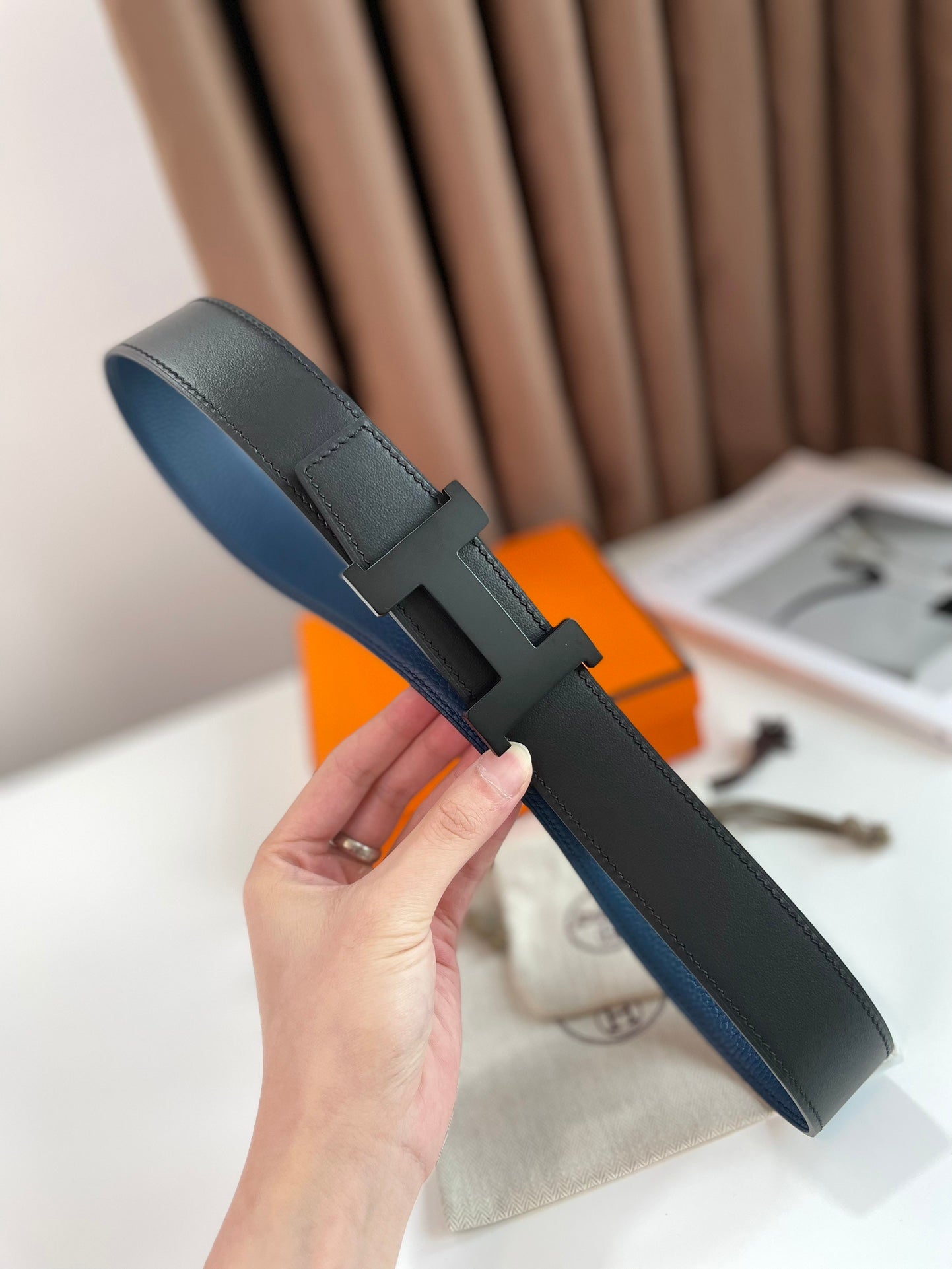 HM CONSTANCE BELT BUCKLE & REVERSIBLE NAVY BLUE AND BLACK LEATHER STRAP 38MM