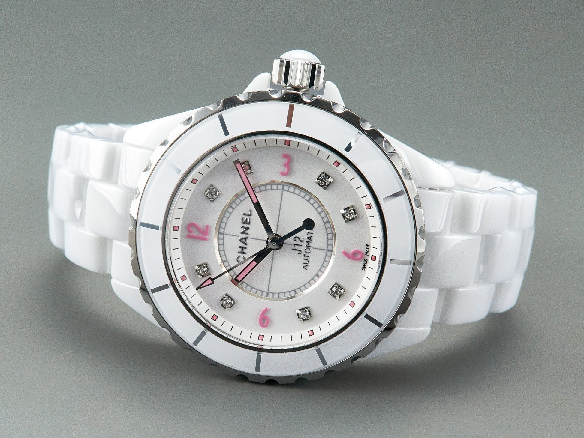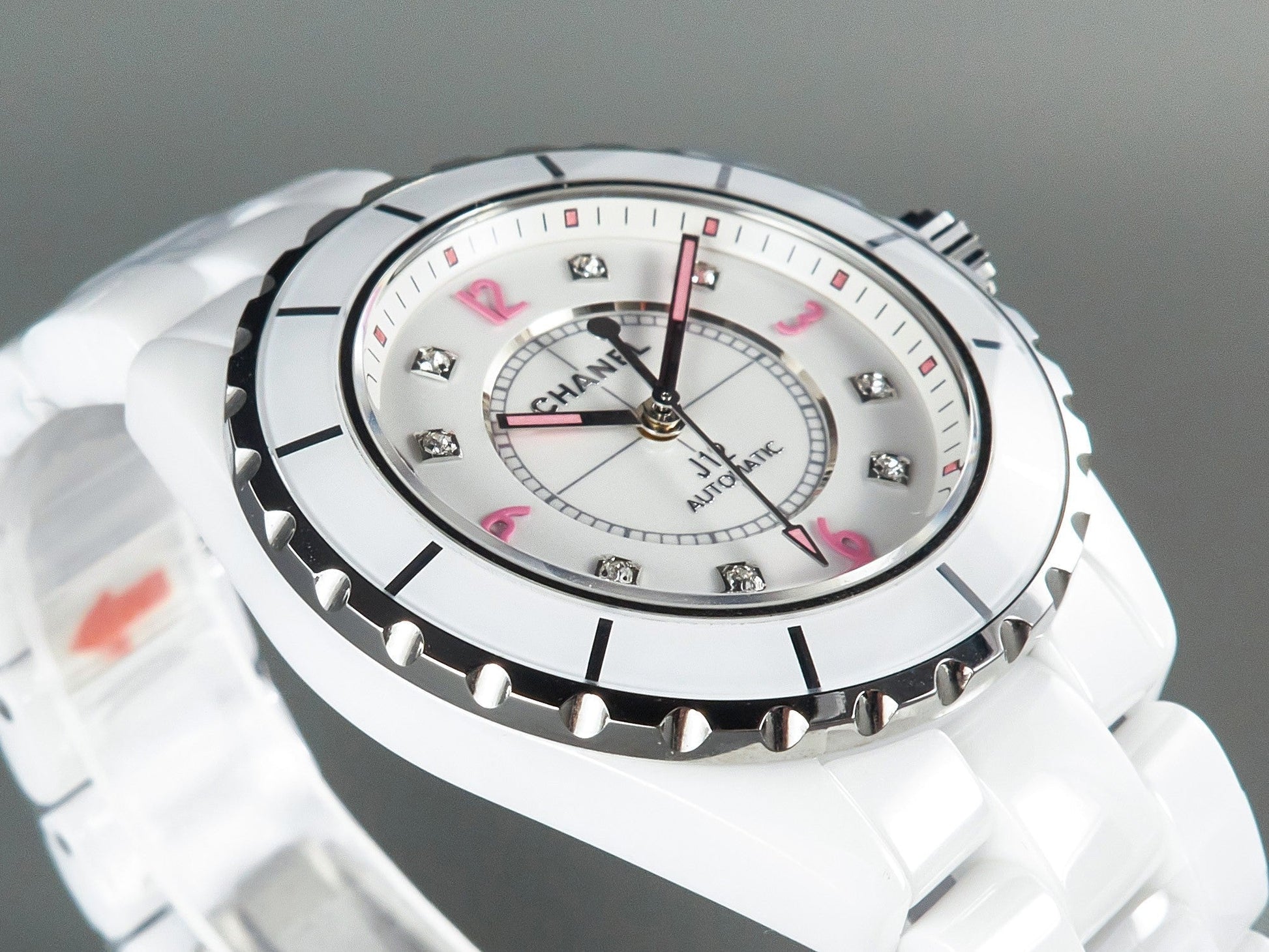 J12 Automatic White Ceramic Pink Diamond Numerals White Dial
