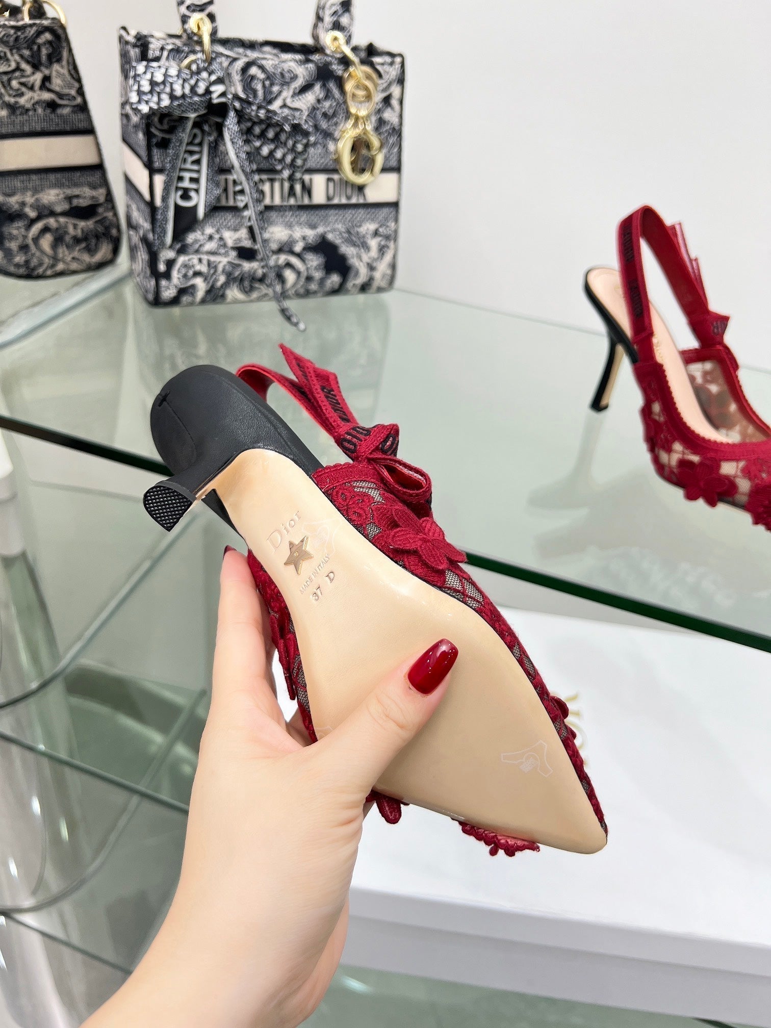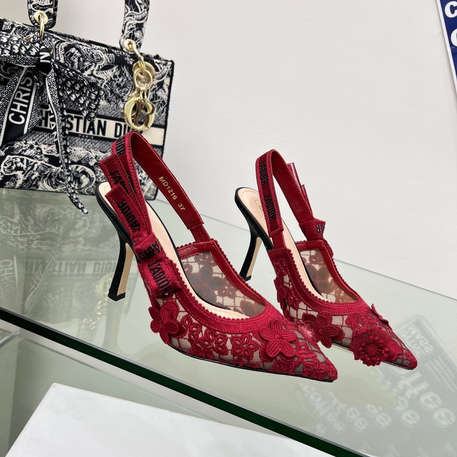 J'Adior Slingback Pump 95mm In Red Floral Embroidered Lace Fabric 100846