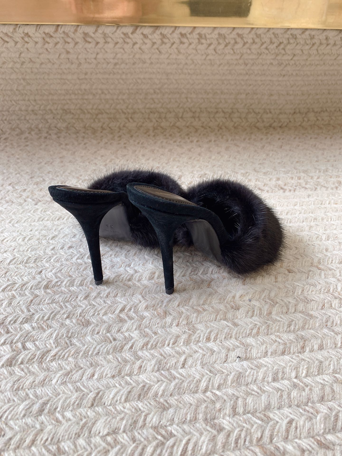 LA 16 HEELED MULES IN BLACK RABBIT FUR AND SMOOTH LAMBSKIN