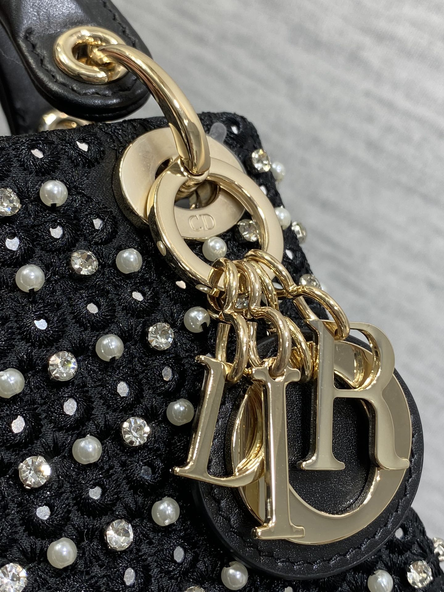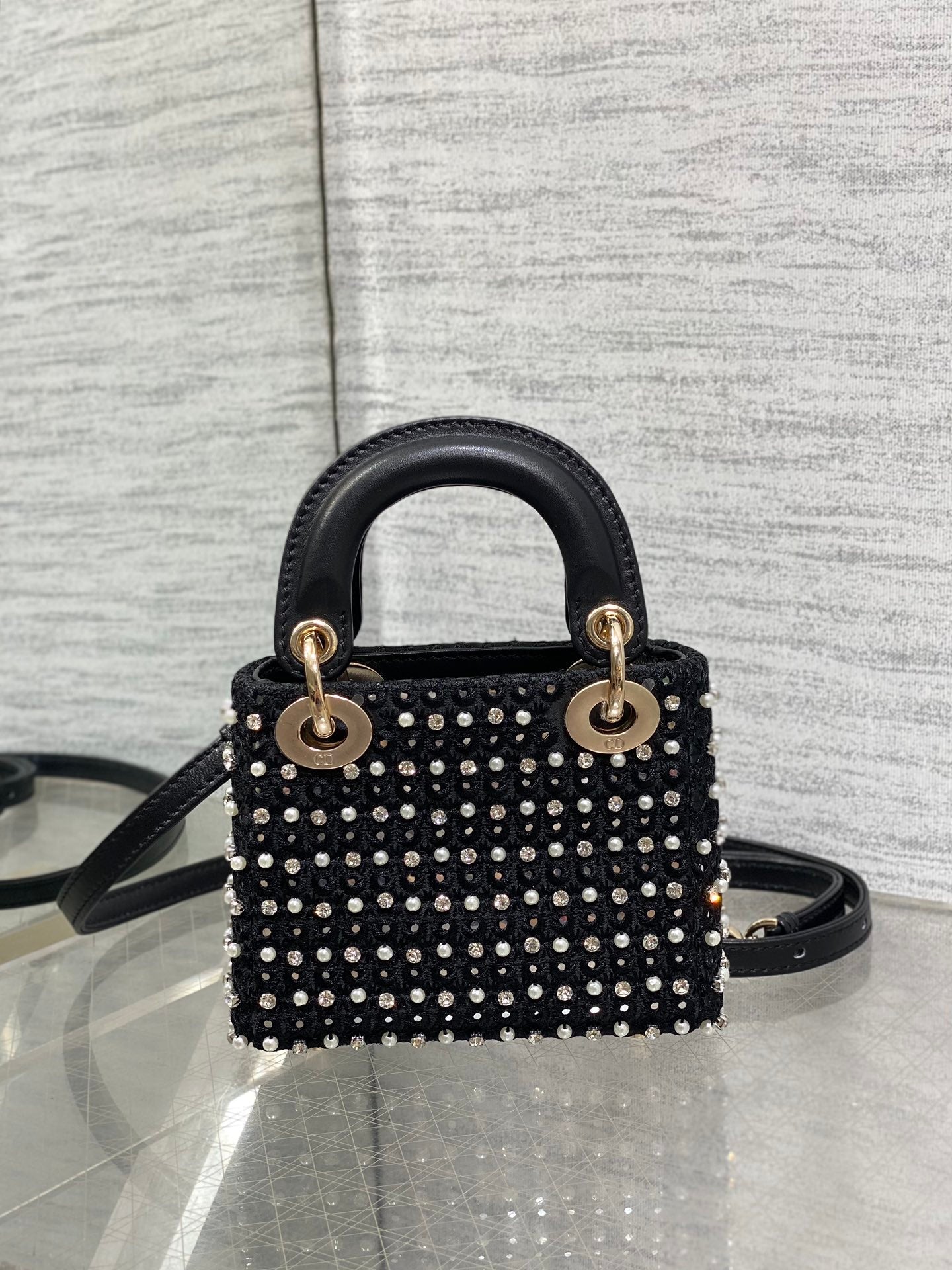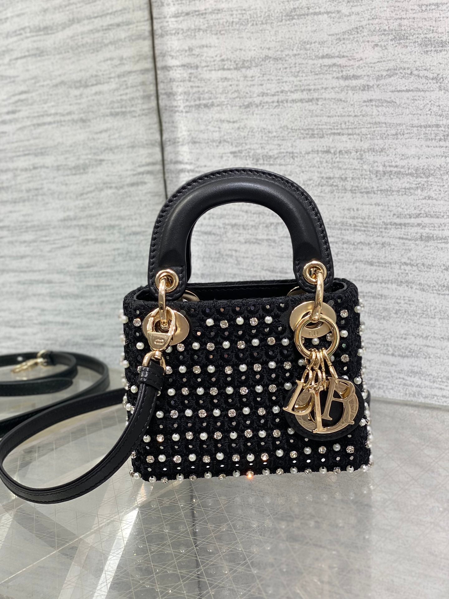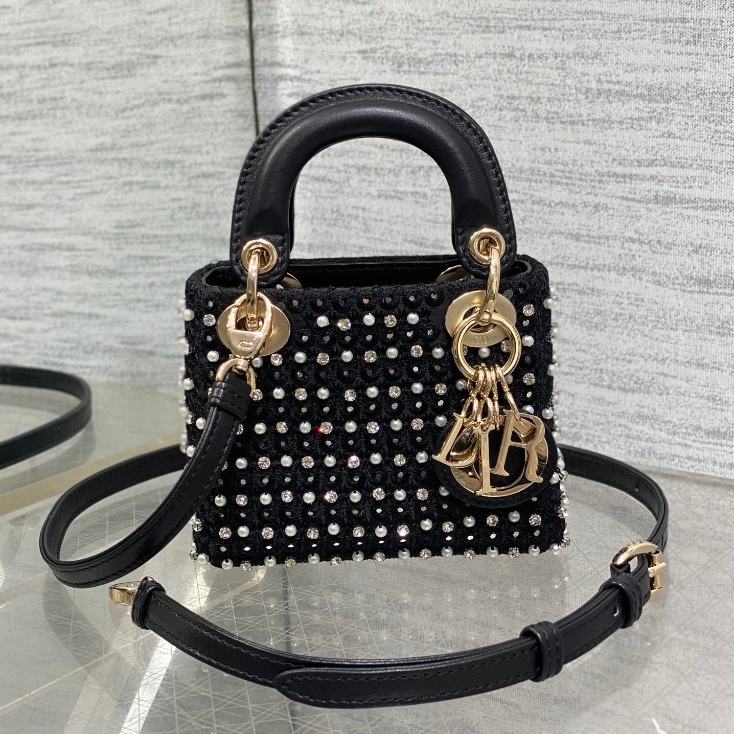 Lady Micro Bag 10cm Black Canvas Diamond Pearl