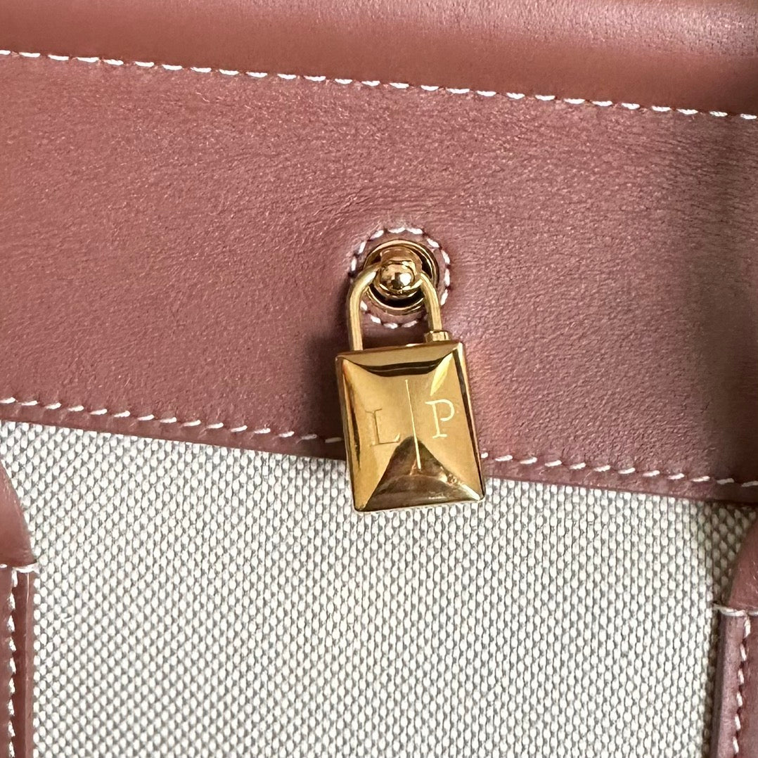 LOOM BAG 25 IN UMBER BROWN CALFSKIN WITH BEIGE LINEN GOLD HARDWARE