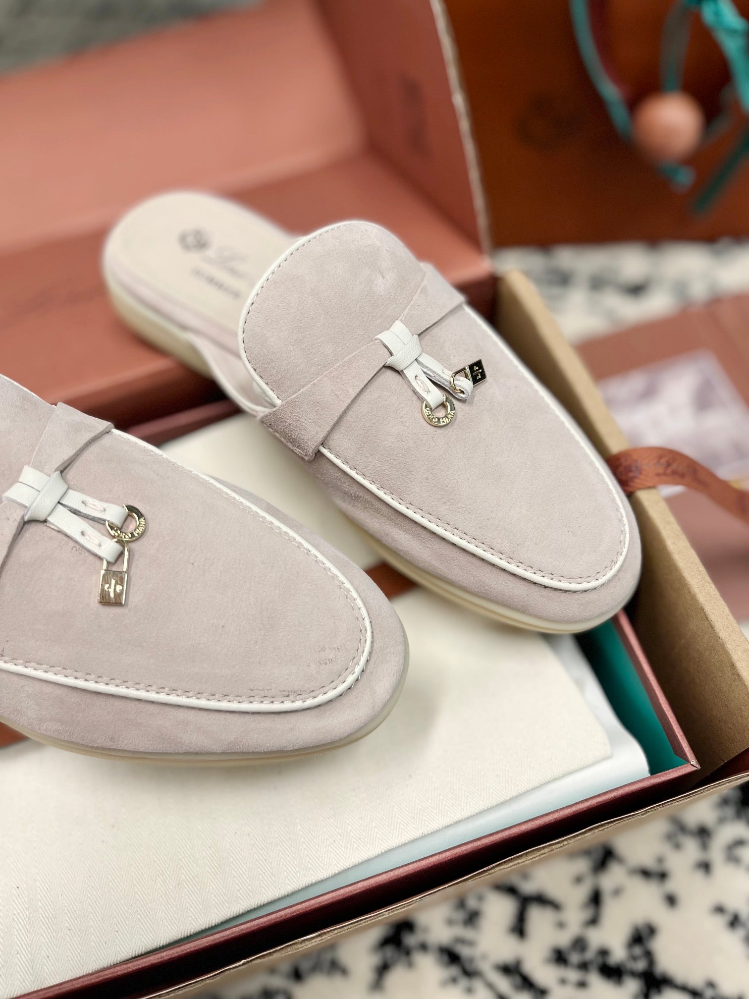Loro Piana Light Grey White Suede Charms Walk Flat Mules
