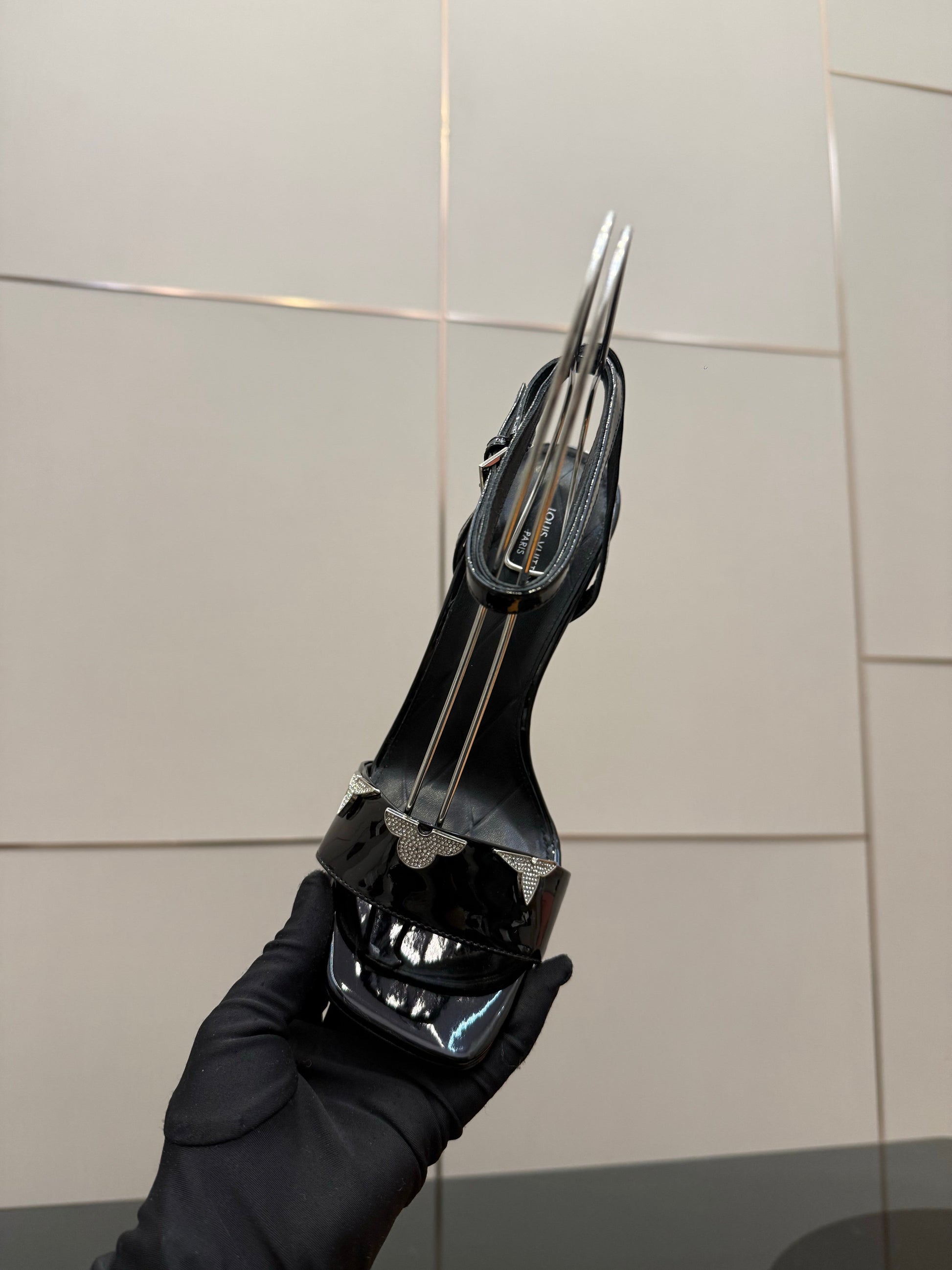 LV 26ss High Heeled Sandals 100 Black Patent Leather 629621