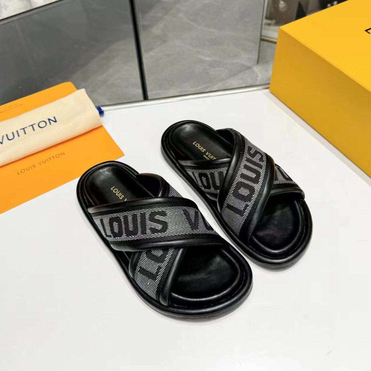 lv bliss cross sandal mule black textile calfskin