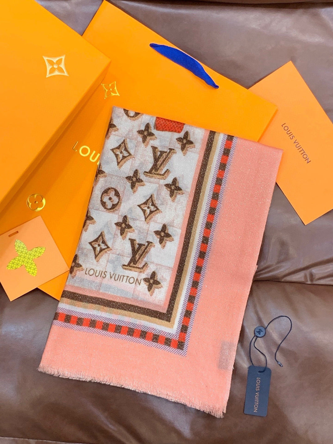 LV Monogram Scarf 200cm White Pink Cashmere 969185
