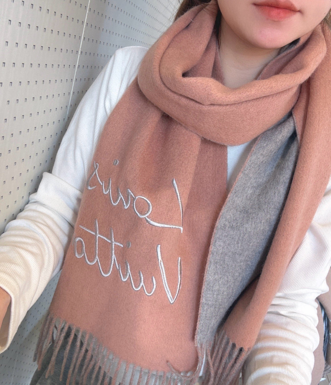 LV Reversible Scarf 180cm Pink Gray Sheep Wool 978753