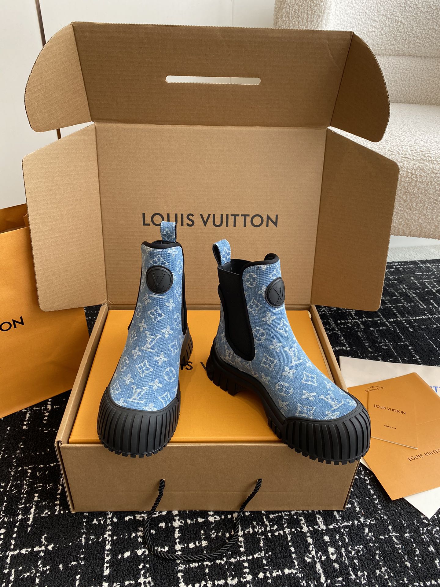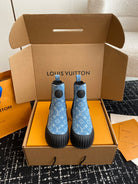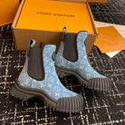 LV Ruby Flat Ankle Boots Light Blue Monogram Jacquard Fabric