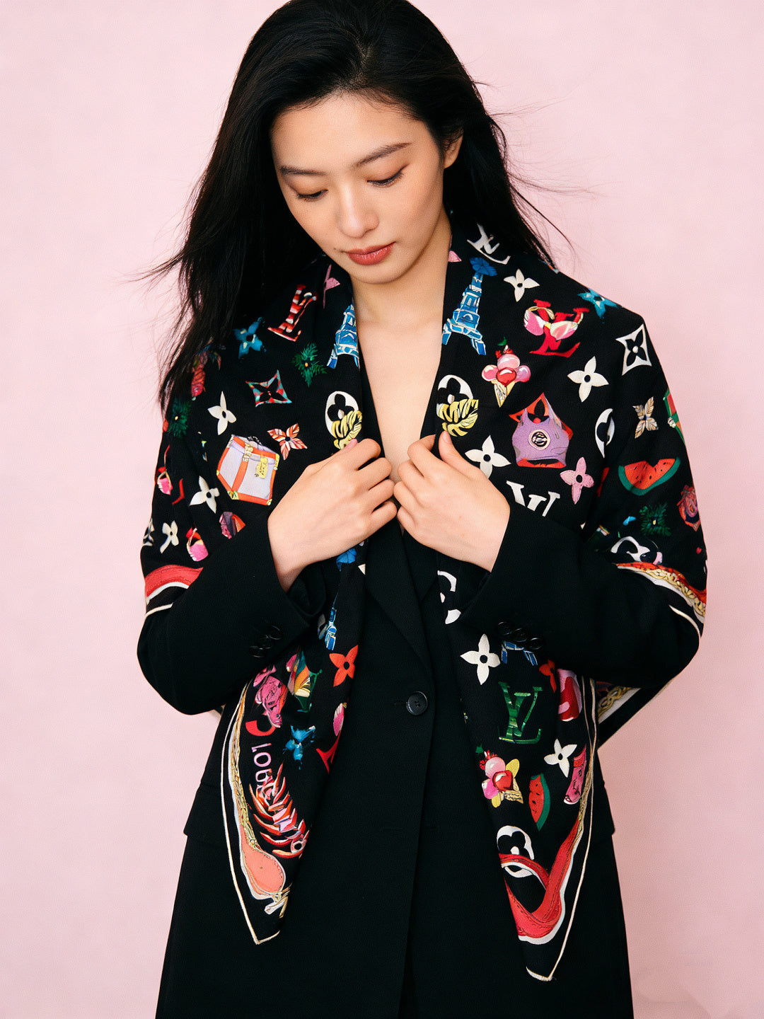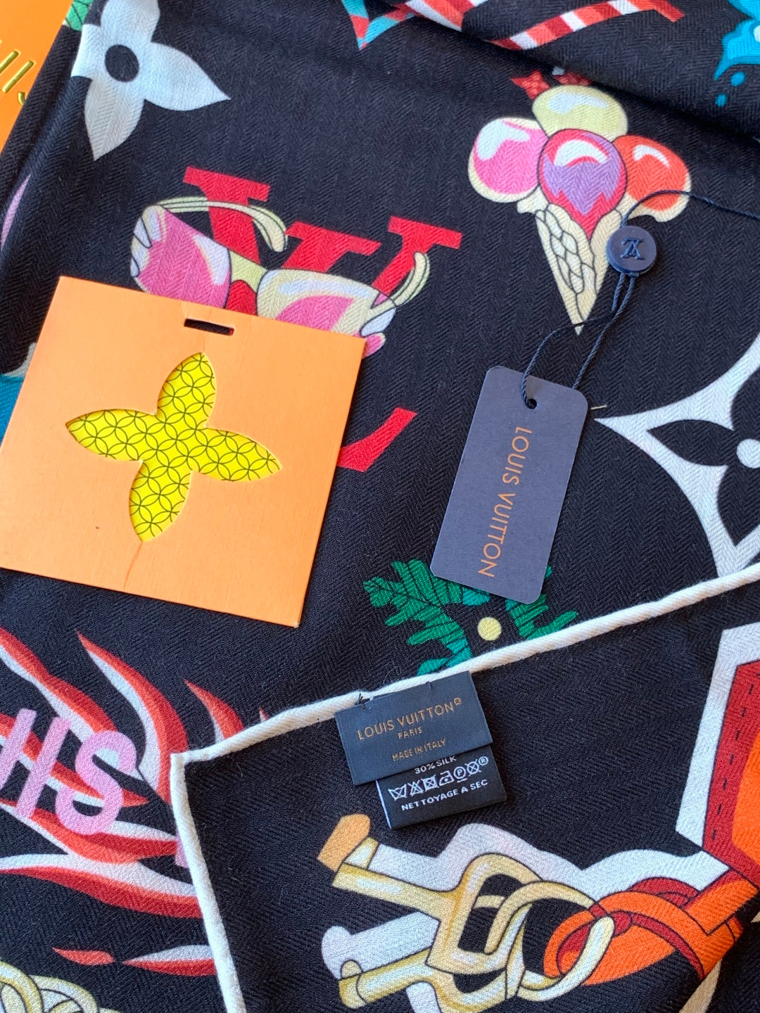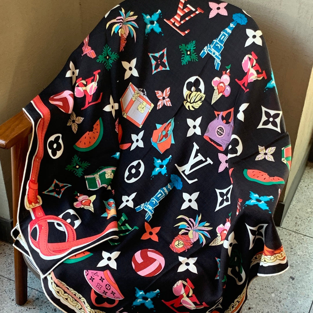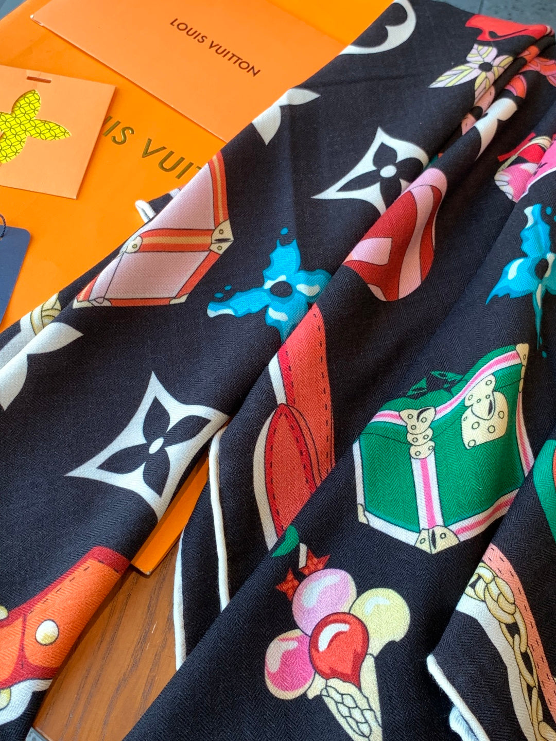 LV Scarf 135cm Black Multicolor Cashmere Mulberry Silk 976764