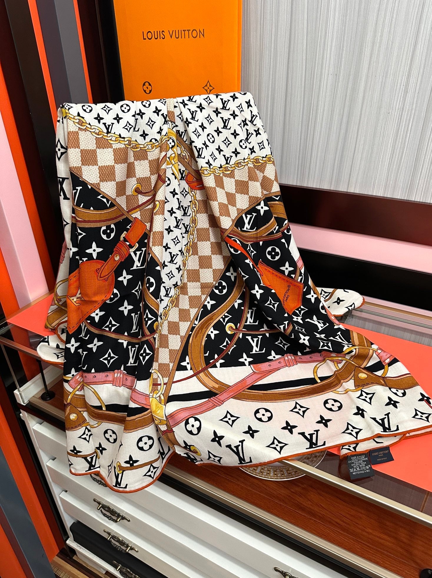 LV Scarf 140cm Black White Brown Silk Cashmere 968685