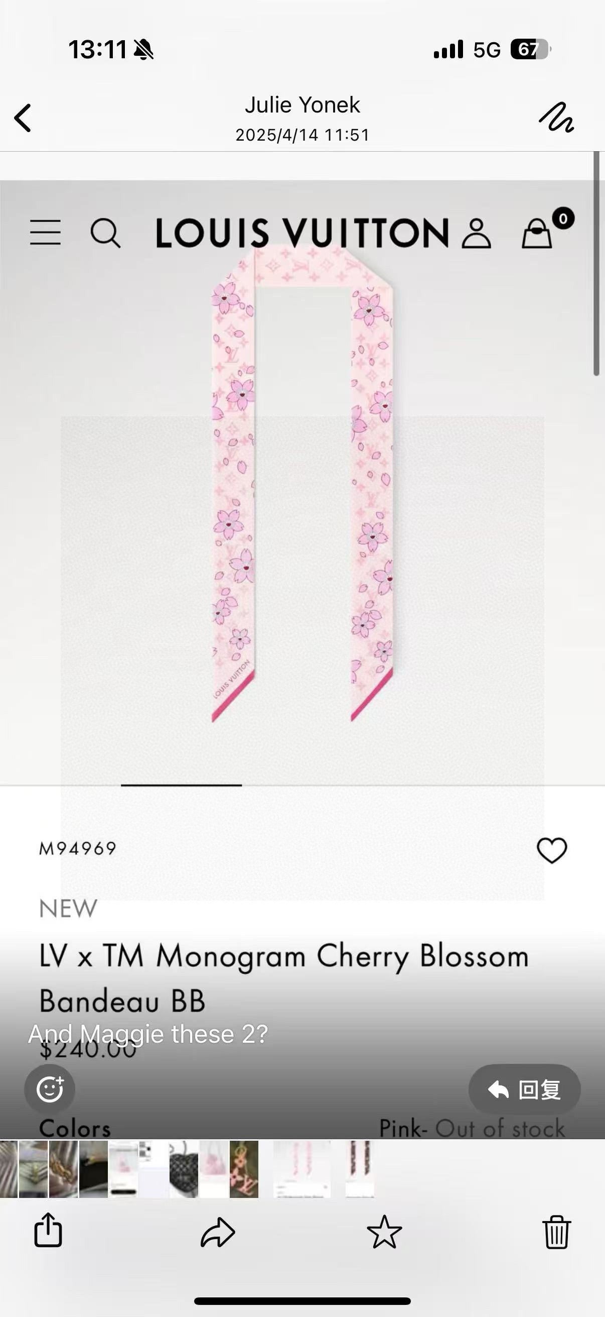 LV Twilly Scarf 120cm Pink Colorful Silk 965654