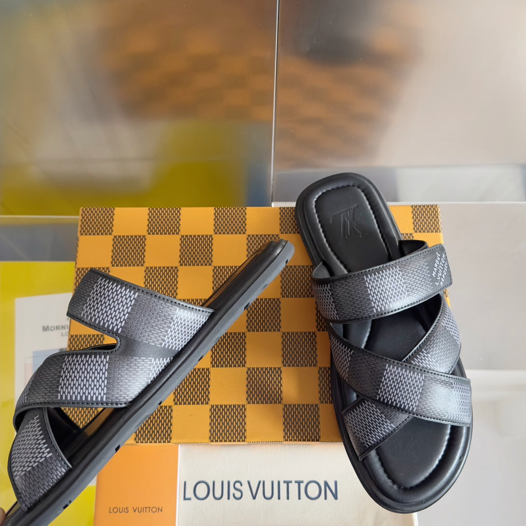 • Premium LV men's slippers, synchronizing with the 2024 early autumn runway collection. The slippers feature a high-quality fabric upper and an original, exclusive comfort sole, ensuring exceptional comfort. These are original factory-followed products.