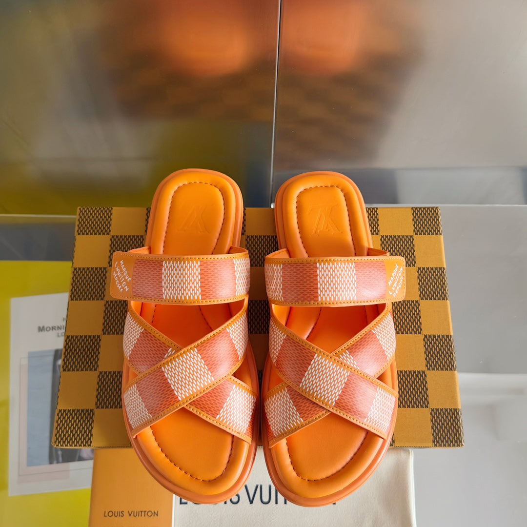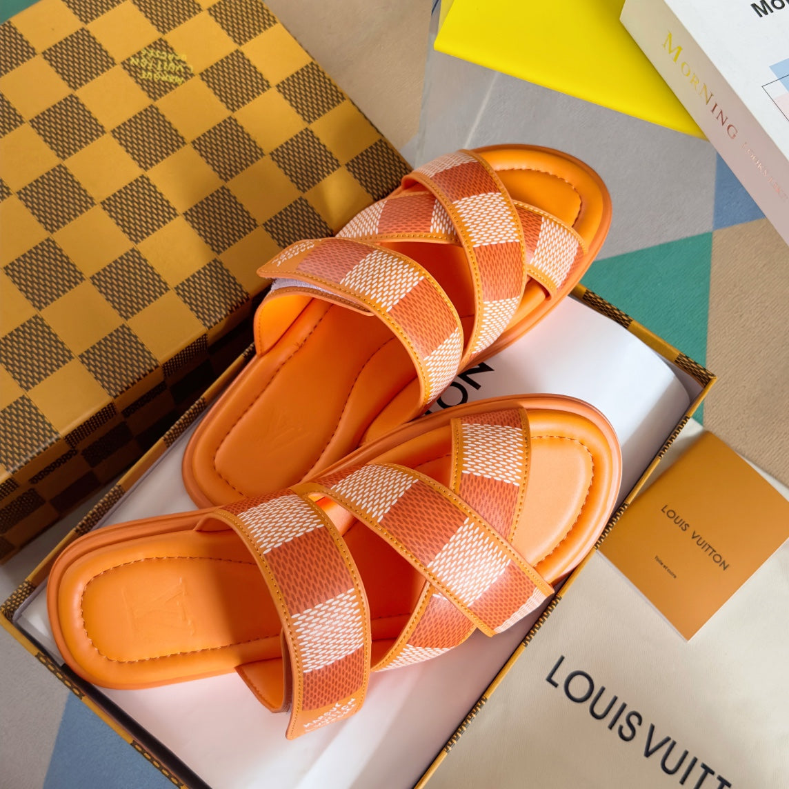 • Premium LV men's slippers, synchronizing with the 2024 early autumn runway collection. The slippers feature a high-quality fabric upper and an original, exclusive comfort sole, ensuring exceptional comfort. These are original factory-followed products.