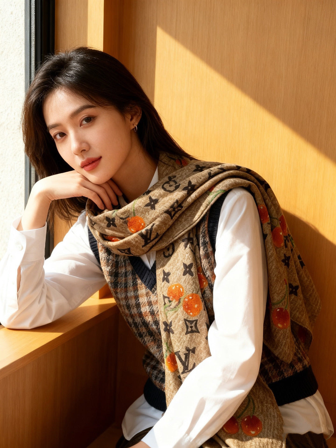 LV X TM MONOGRAM Scarf Light Brown Orange Silk Cashmere 965426