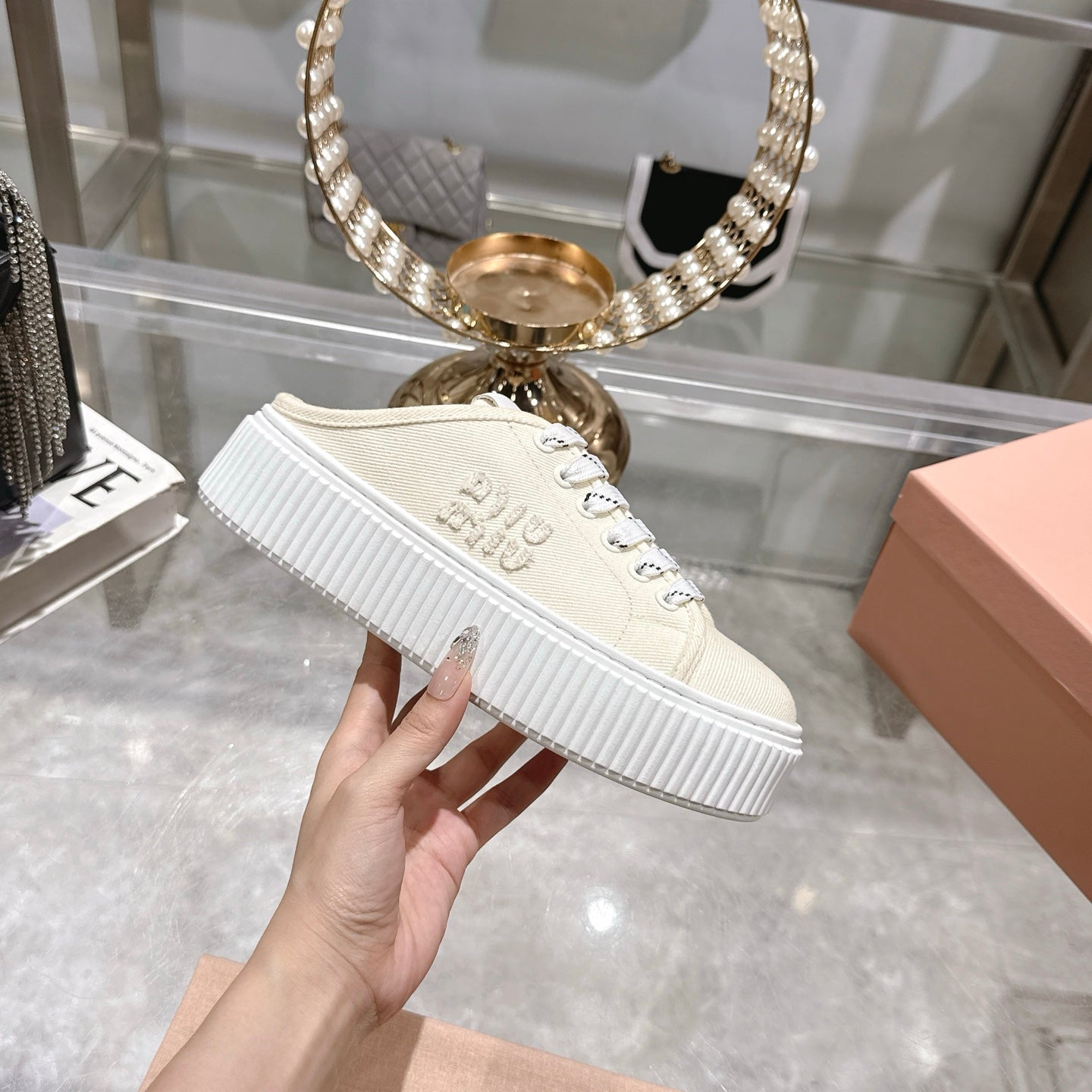 Miu 25C Sneaker Mules Ivory Demin Fabric 235317