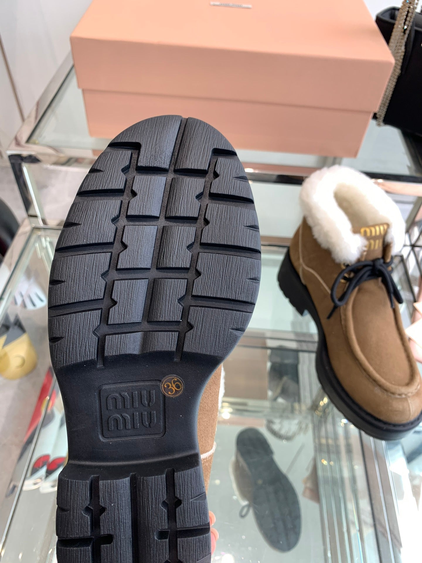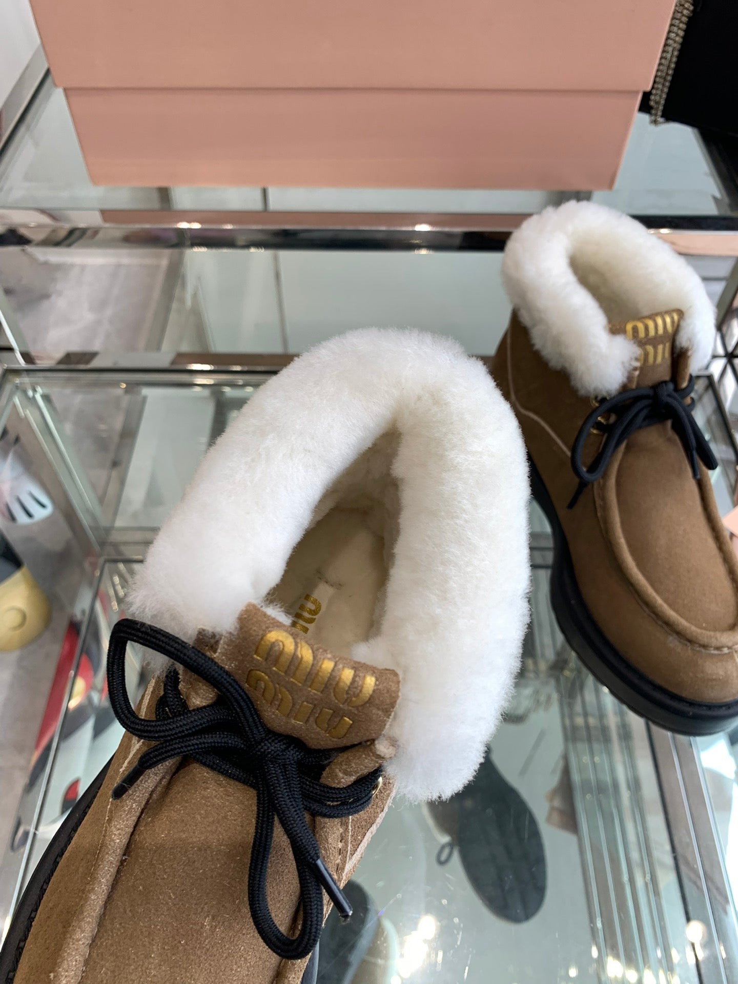 Miu Short Wool Boots Vintage Brown Open-Hemmed Cowhide