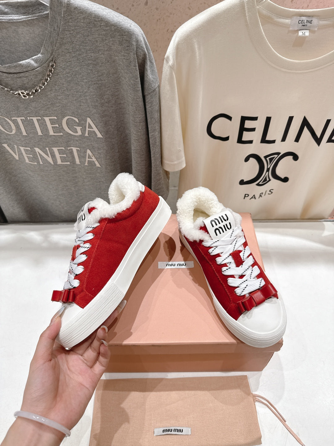 MiuMiu 25 Sneaker Red White Suede Cowhide Fur 535585