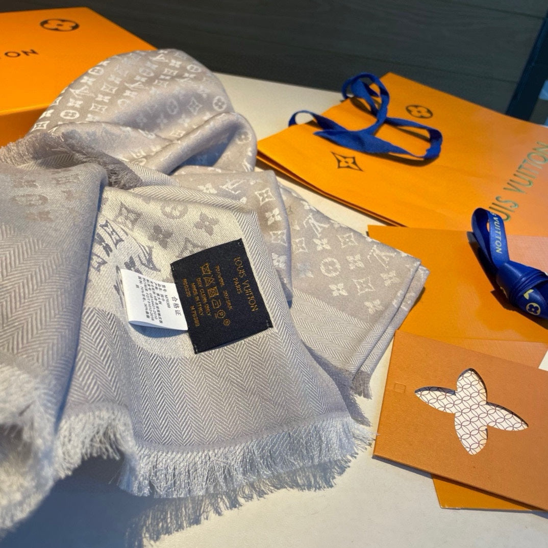MONOGRAM SHINE SCARF 120 CM IN PASTEL GRAY WOOL AND MULBERRY SILK 398195